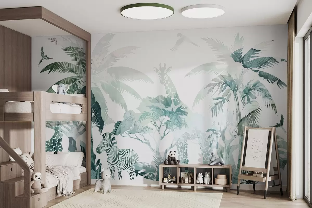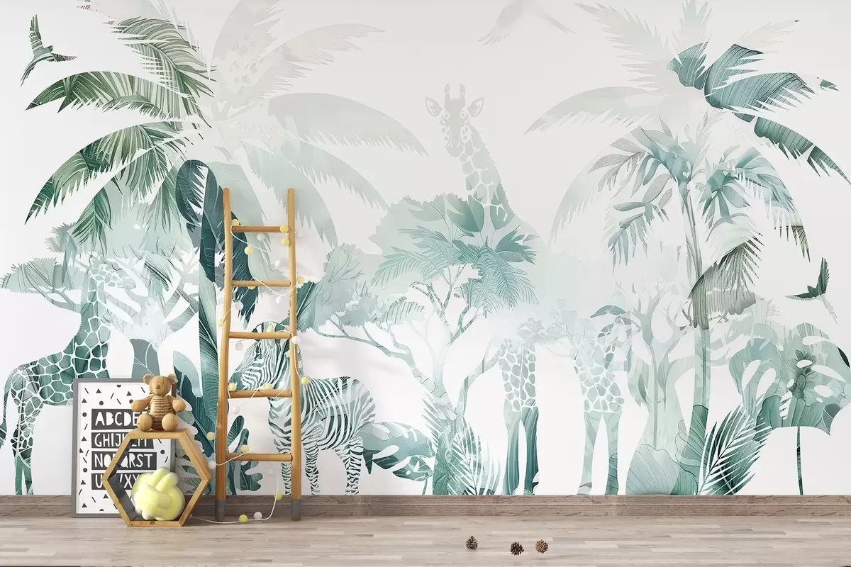 Fototapetai Safario gyvūnai, palmės, džiunglės, zebras, žirafa, švelnios žalios spalvos Nr. w02267
