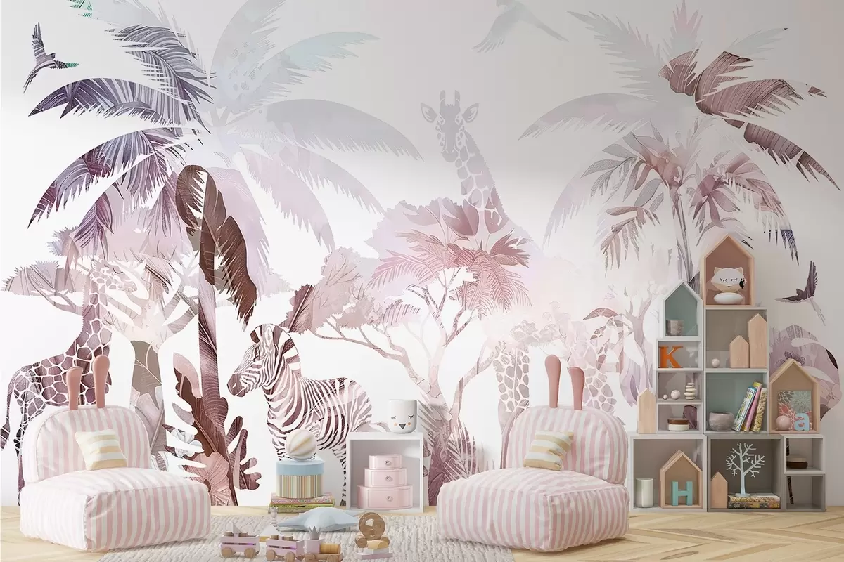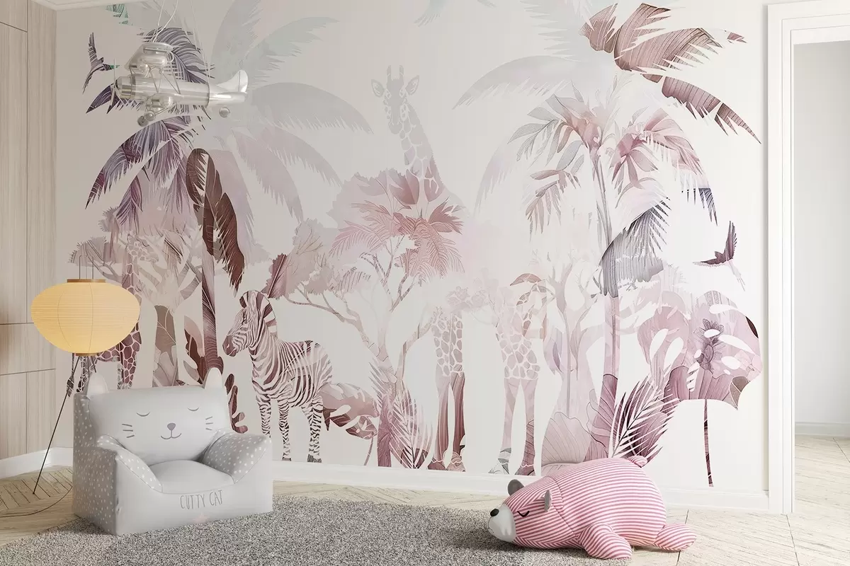 Fototapetai Safario gyvūnai, palmės, džiunglės, zebras, žirafa, švelnios rožinės spalvos Nr. w02267v1