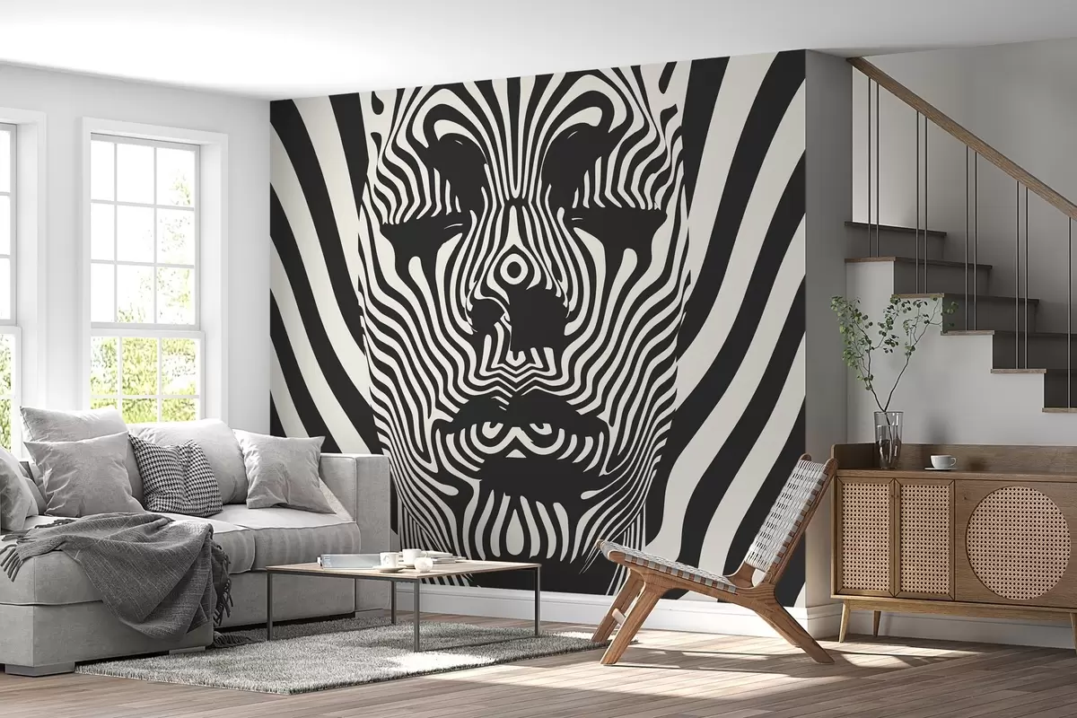 Fototapetai Op art stiliaus grotelės su abstrakčiu veidu, banguotomis linijomis šviesiame fone. Nr. w02285