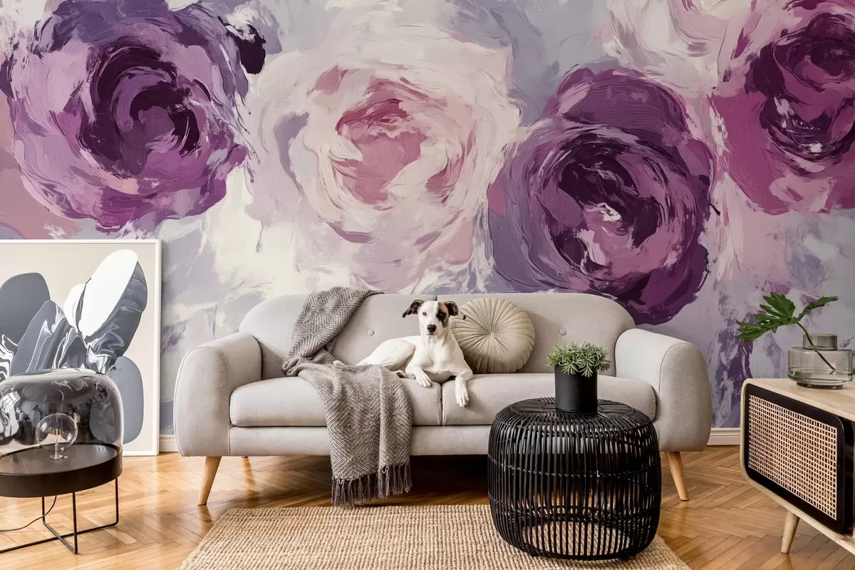 Fototapetai Tapetai yra aliejinės tapybos imitacijos stiliaus, ant jų pavaizduoti dideli, purūs pastelinių atspalvių rožių žiedai. Nr. w02288