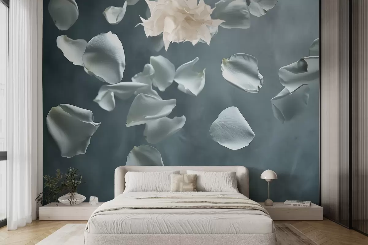 Fototapetai Švelnūs rožių žiedlapiai krenta žemyn tamsiame fone Nr. w02289
