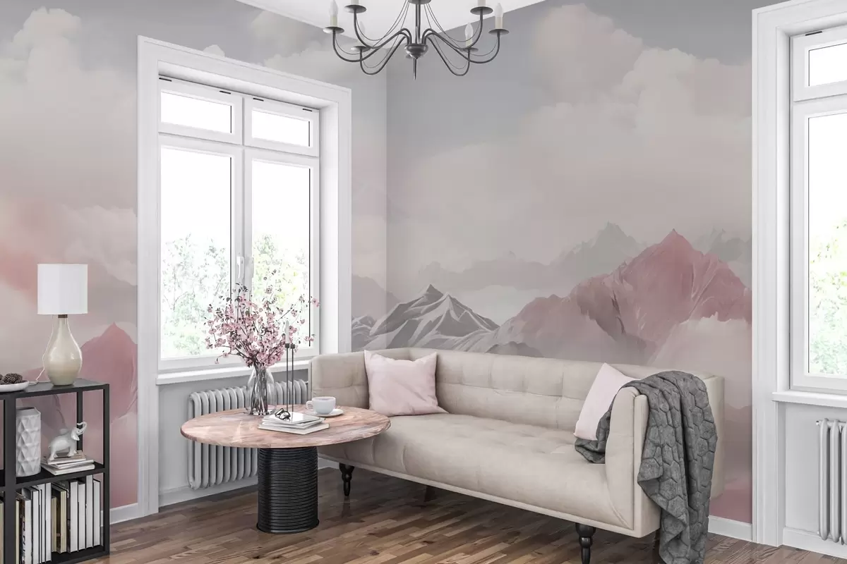 Fototapetai Rausvi kalnai rūke ir pūkuotuose debesyse Nr. w02296