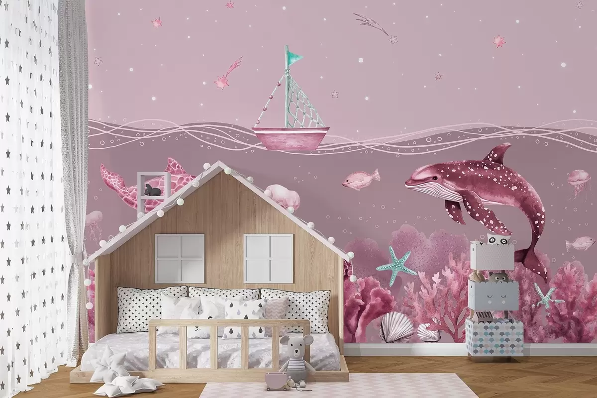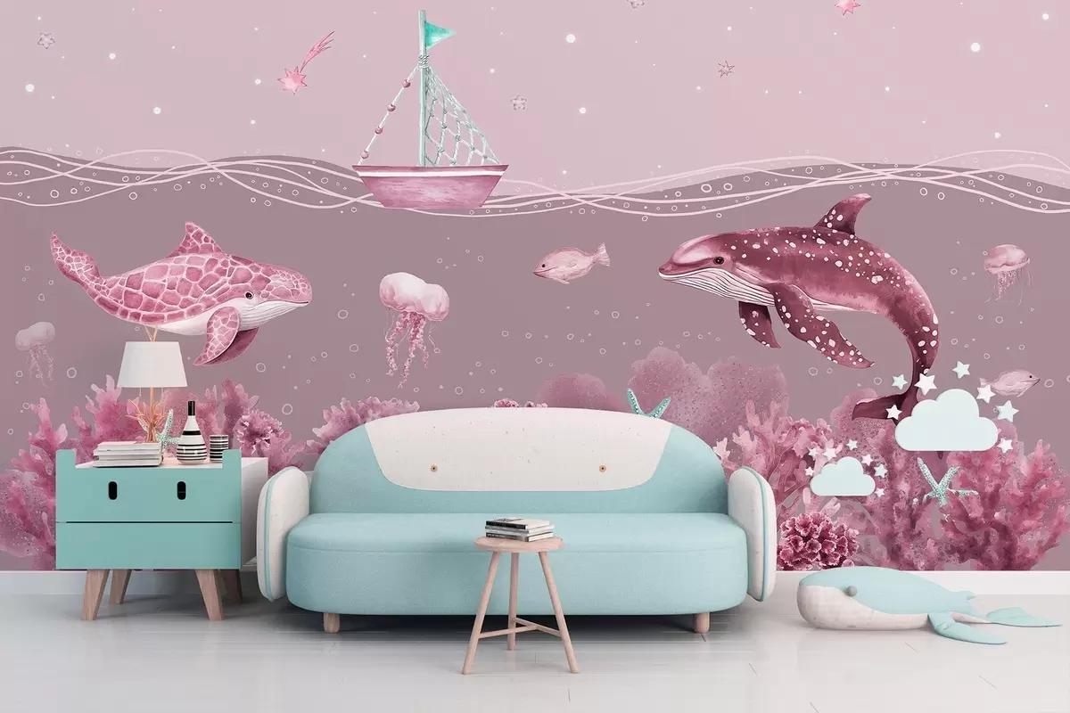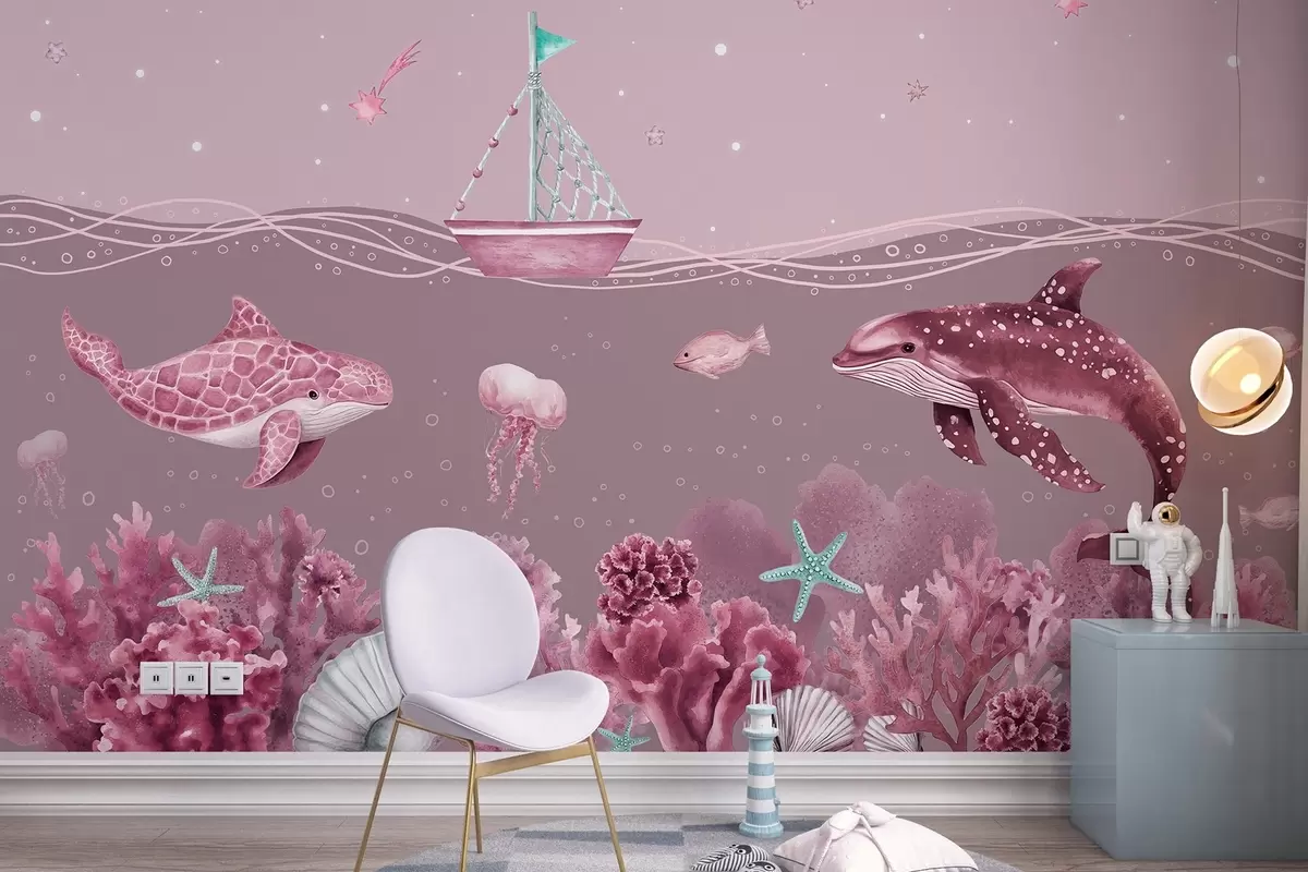 Fototapetai Jūros gyvenimas, akvarelės stilius, koralai, valtis, delfinas, medūzos, žvaigždėtas dangus, rožinės spalvos Nr. w02310v2