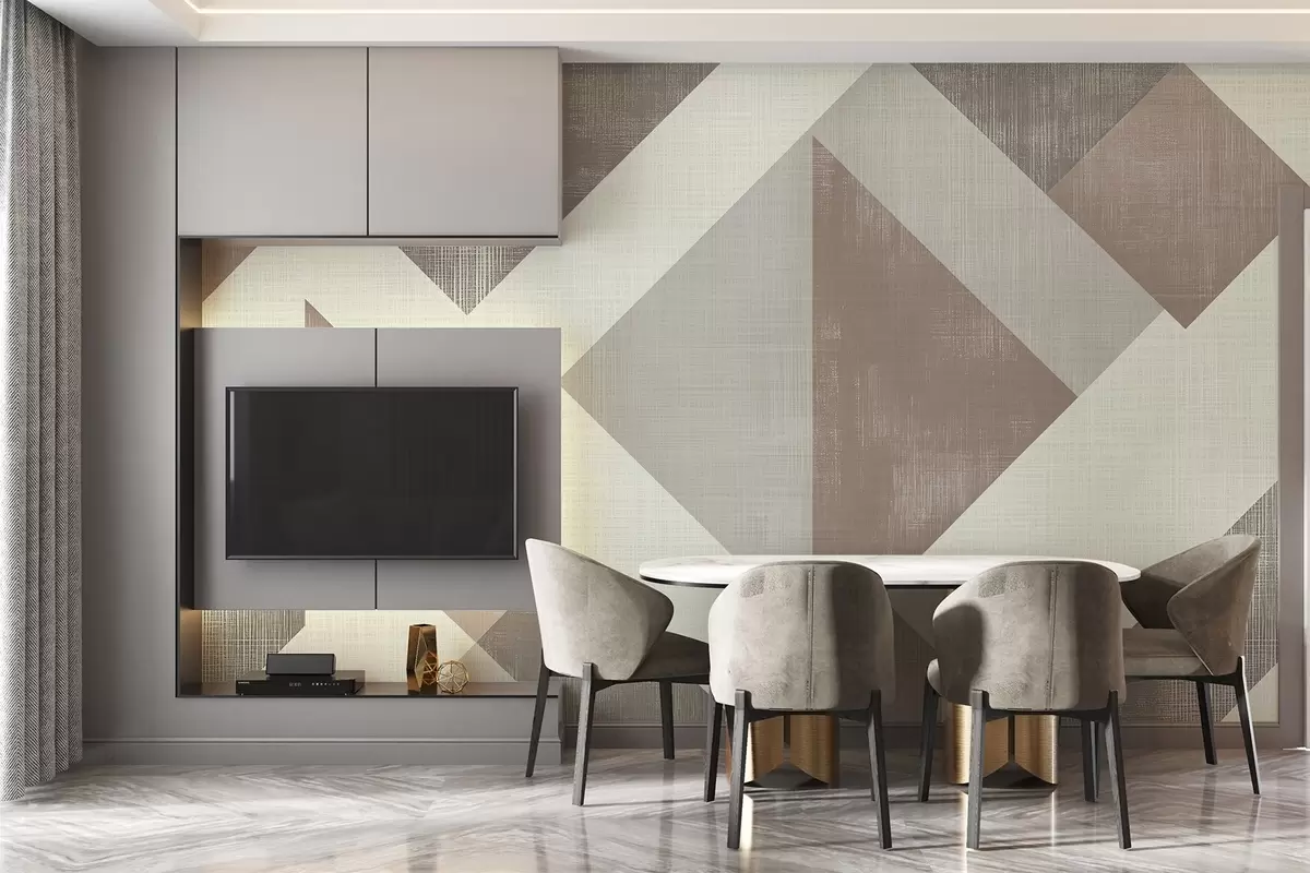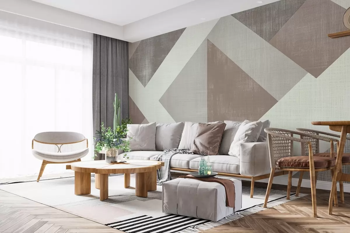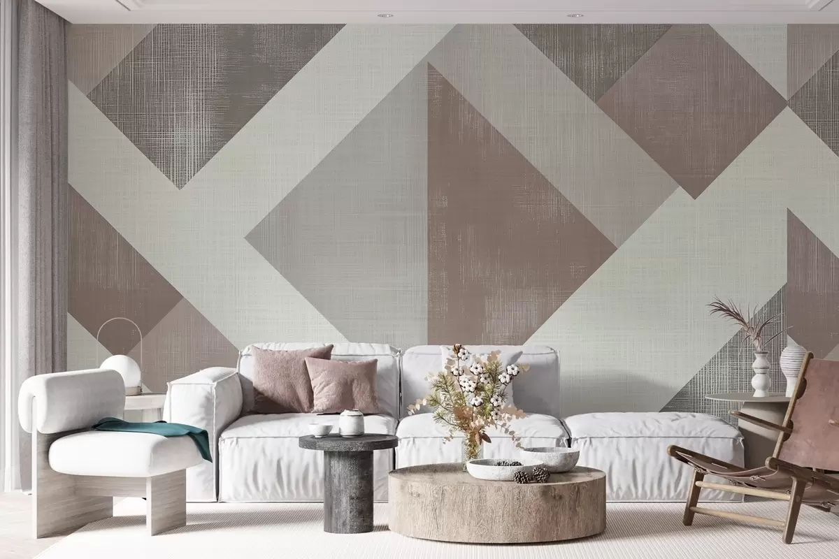 Fototapetai Modernus geometrinis tapetų dizainas su persidengiančiomis minkštų smėlio, žalios ir pilkos spalvų formomis Nr. w02341v1