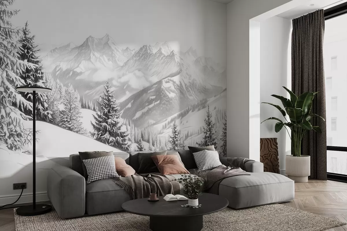 Fototapetai Žiema kalnuose, miškas, Alpės, piešinys pieštuku, gamtos peizažai Nr. w02353