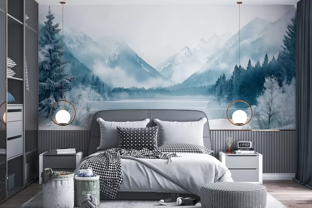 Fototapetai Žiemos kalnai, užšaldytas ežeras, pušynas, mėlyna spalvų paletė, akvarelės stilius Nr. w02354