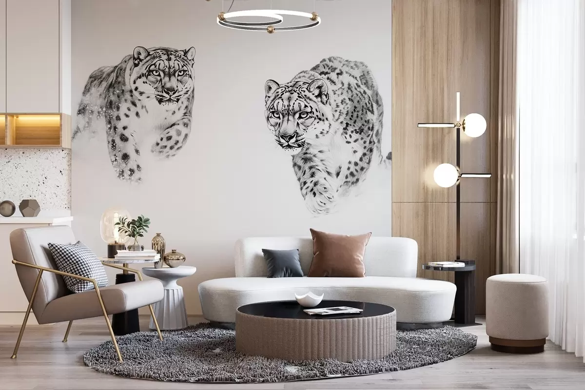 Fototapetai Sniego leopardai, žiema, laukiniai gyvūnai, piešinys pieštuku, minimalizmas Nr. w02359