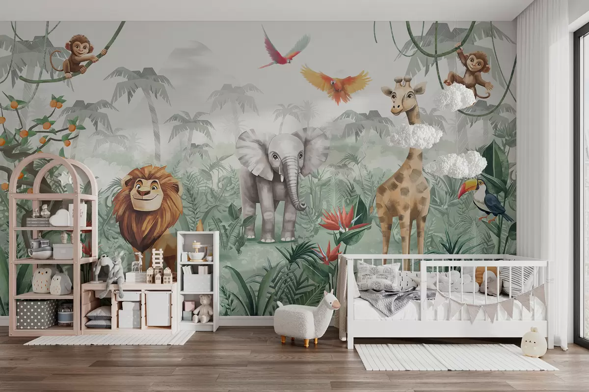Fototapetai Vaikų džiunglių dizainas su liūtu, žirafa, drambliu ir papūgomis Nr. w02440