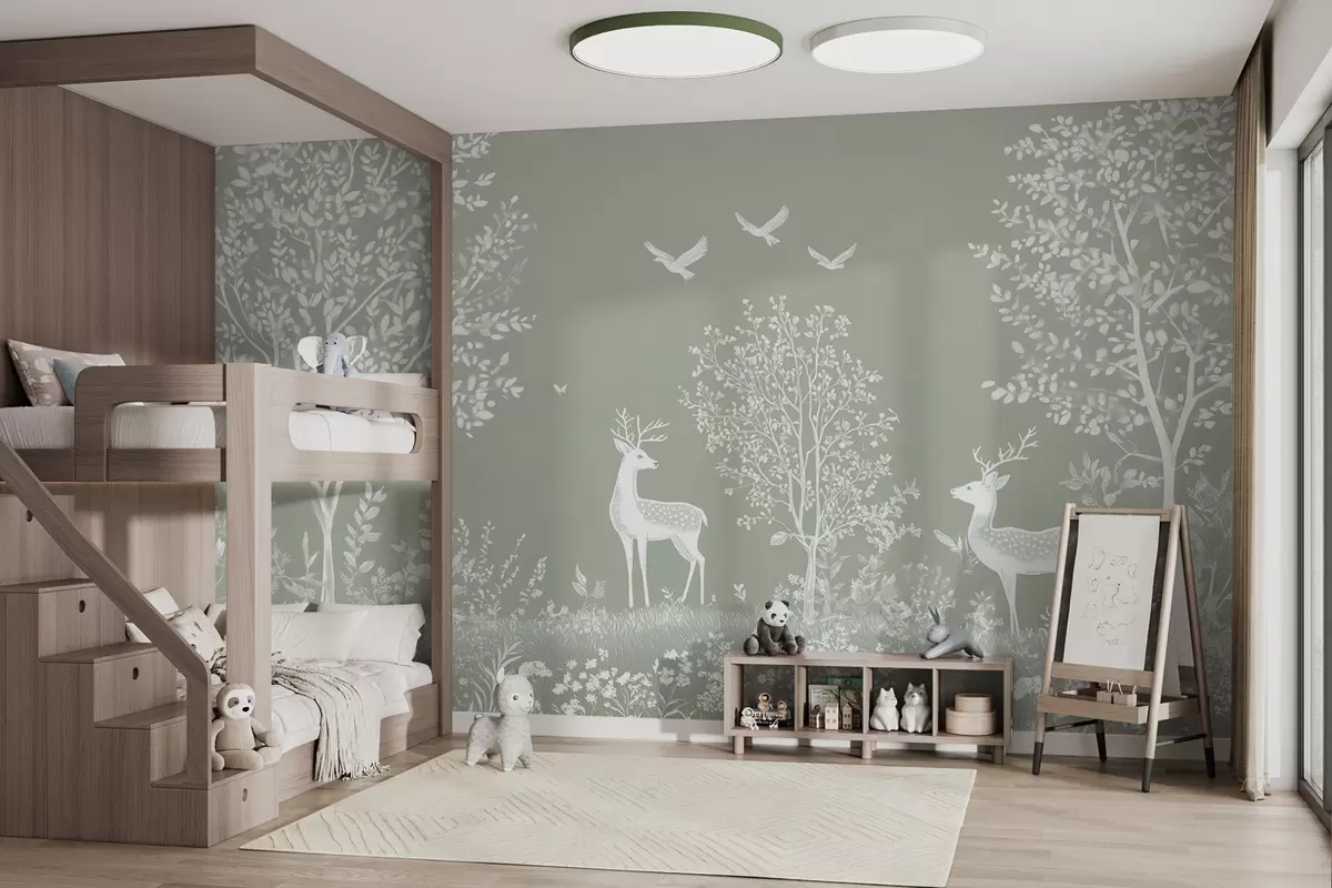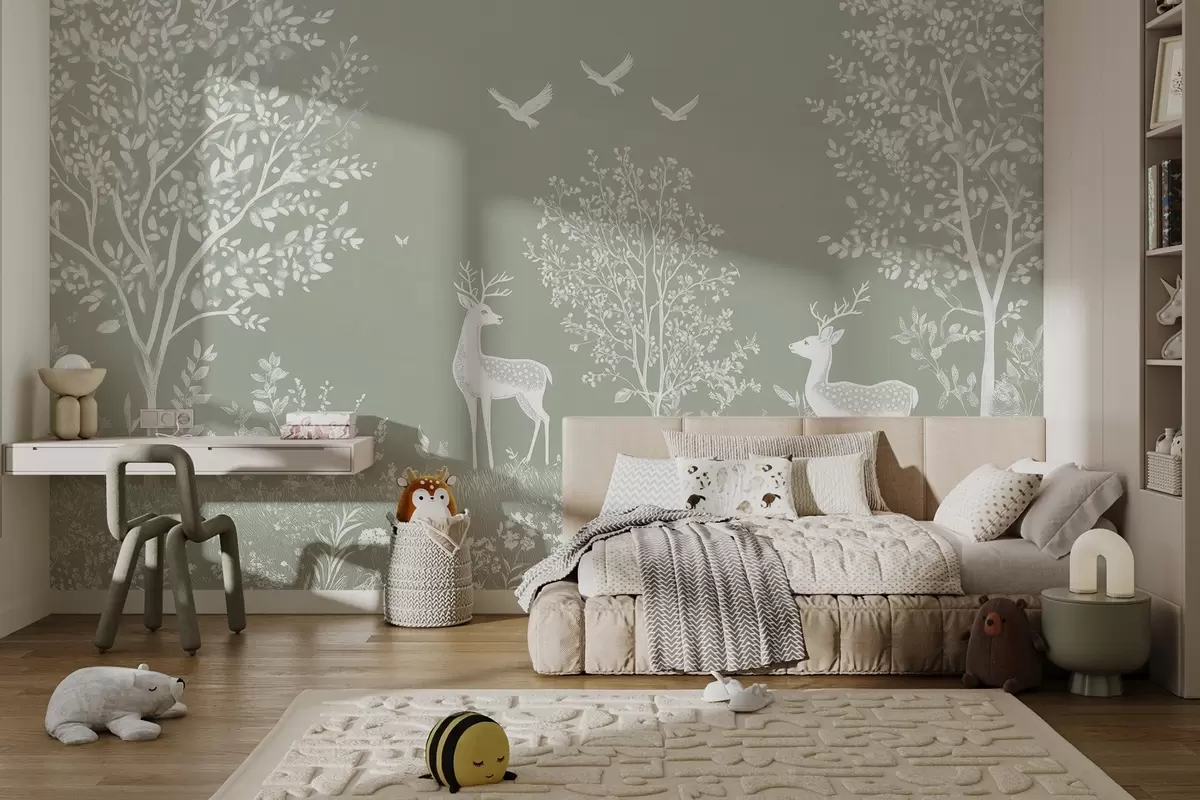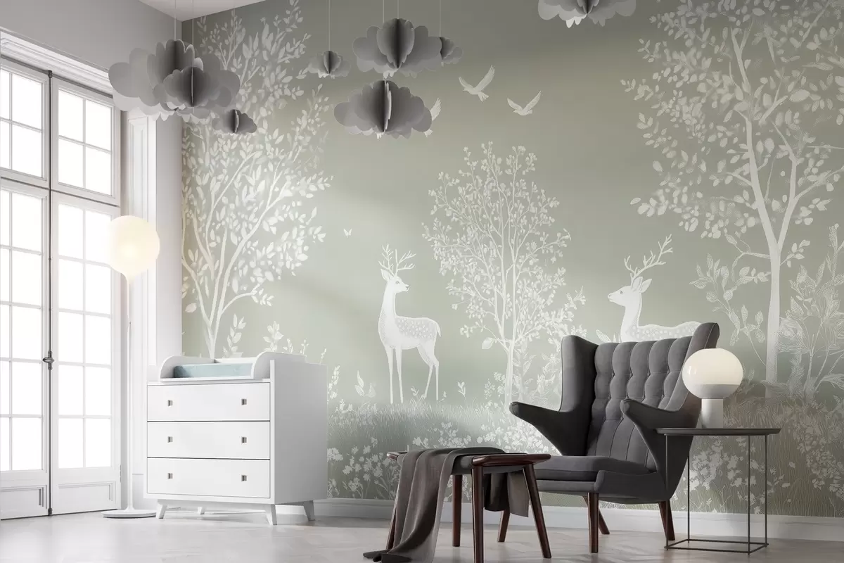 Fototapetai miškas su elniais kreidos piešinio stiliumi alyvuogių fone Nr. w02444v1