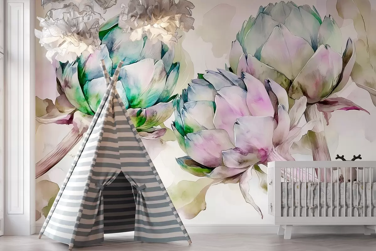 Fototapetai Artišokai akvarelės stiliaus, gėlės, violetinė ir žalia Nr. w02481