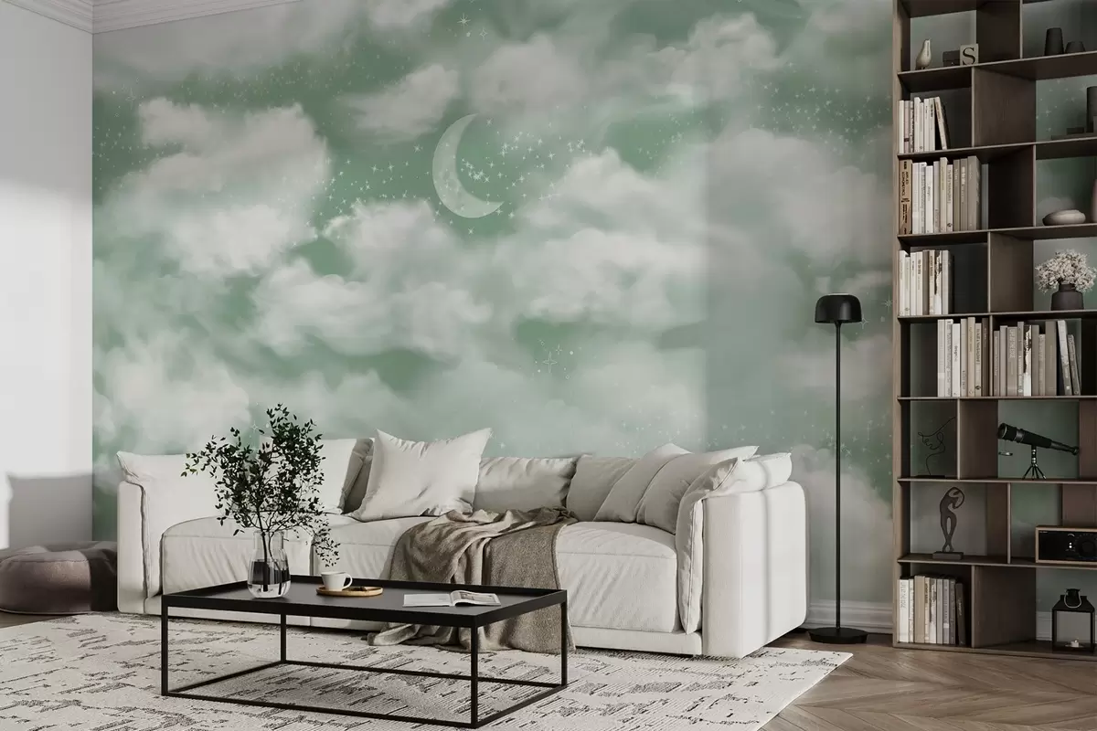 Fototapetai Žvaigždėtas dangus su mėnuliu ir debesimis, svajingas, nežemiškas, švelnių žalių spalvų Nr. w02515v2