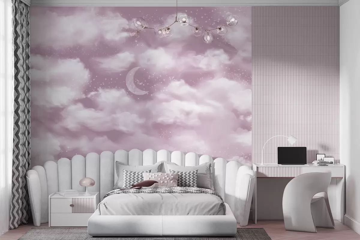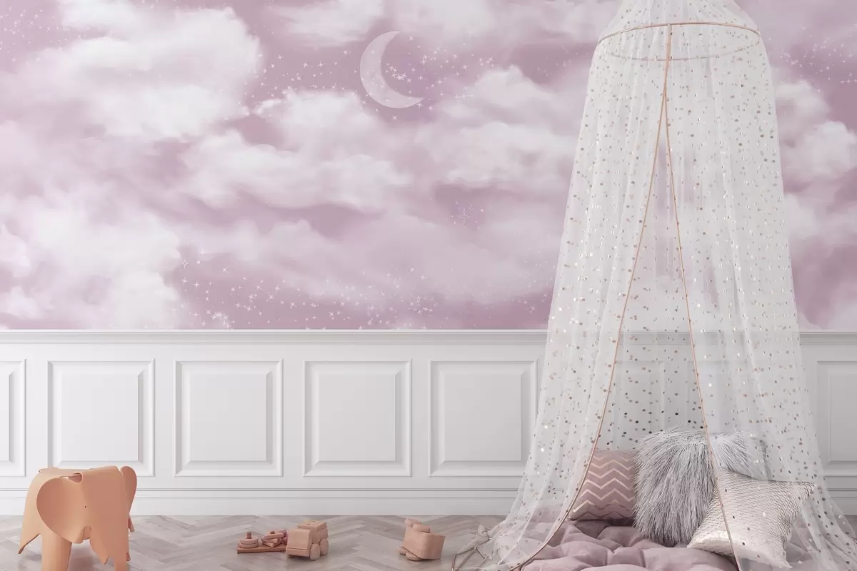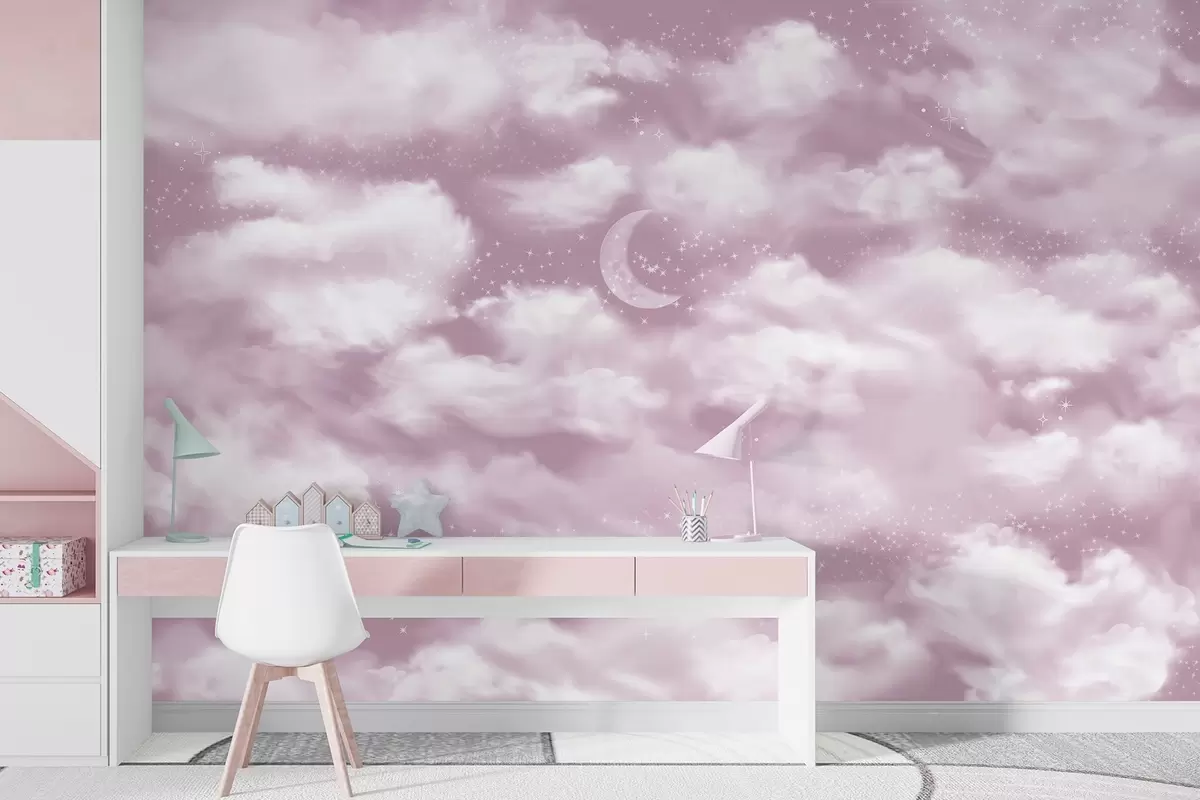 Fototapetai Žvaigždėtas dangus su mėnuliu ir debesimis, svajingas, nežemiškas, švelniai rožinės spalvos Nr. w02515v3