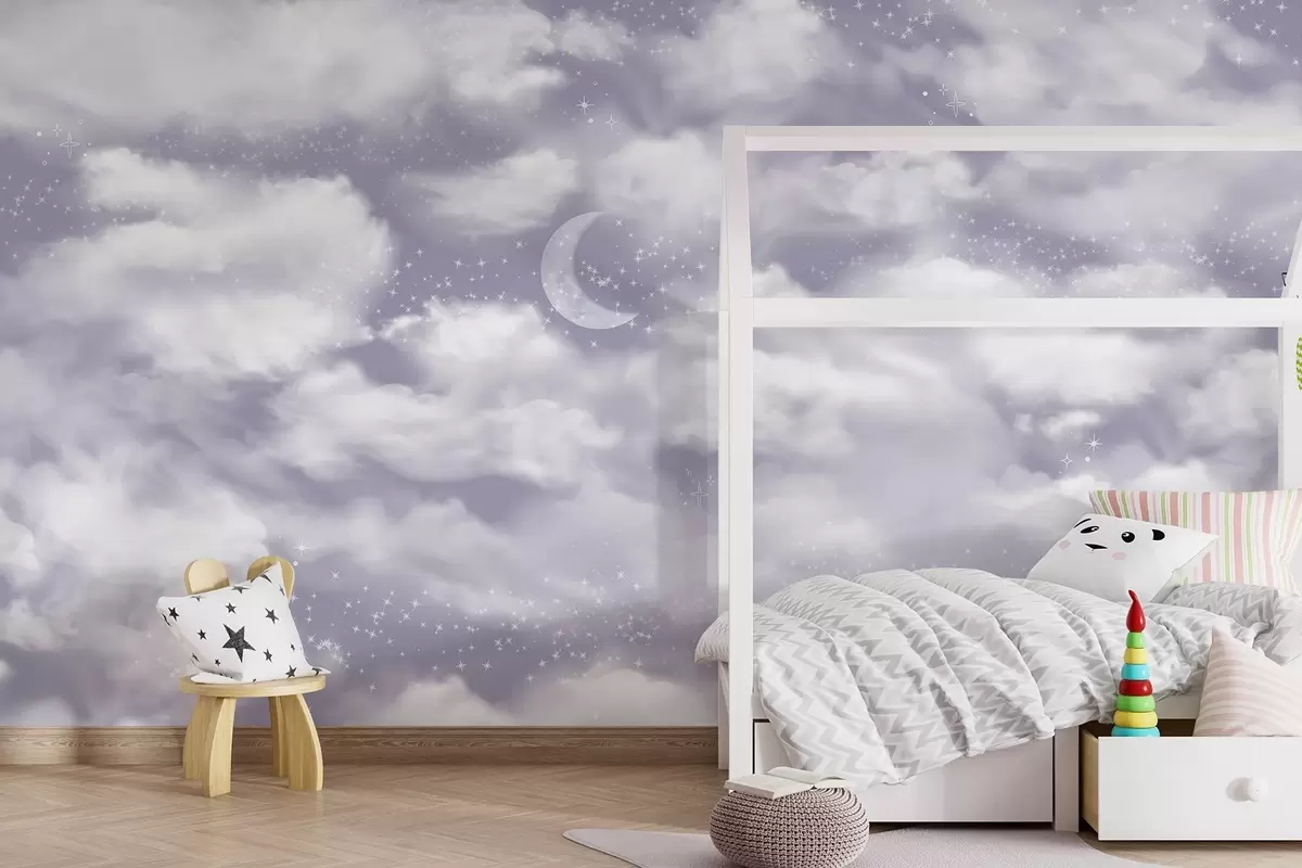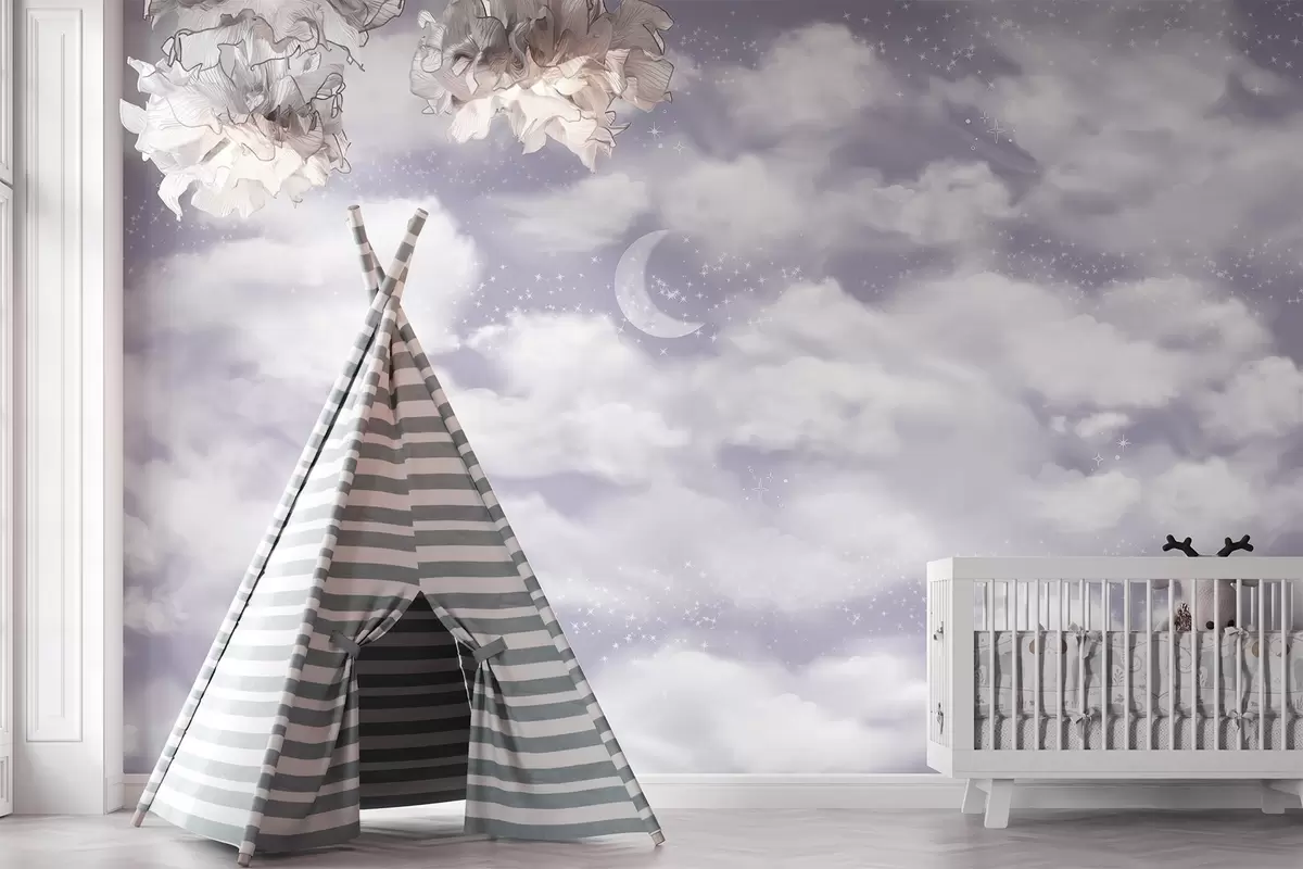 Fototapetai Žvaigždėtas dangus su mėnuliu ir debesimis, svajingas, nežemiškas, švelnių violetinių spalvų Nr. w02515v4