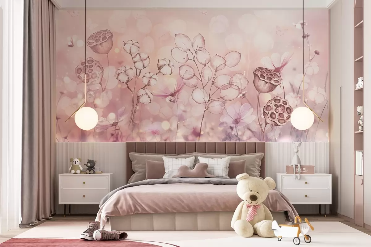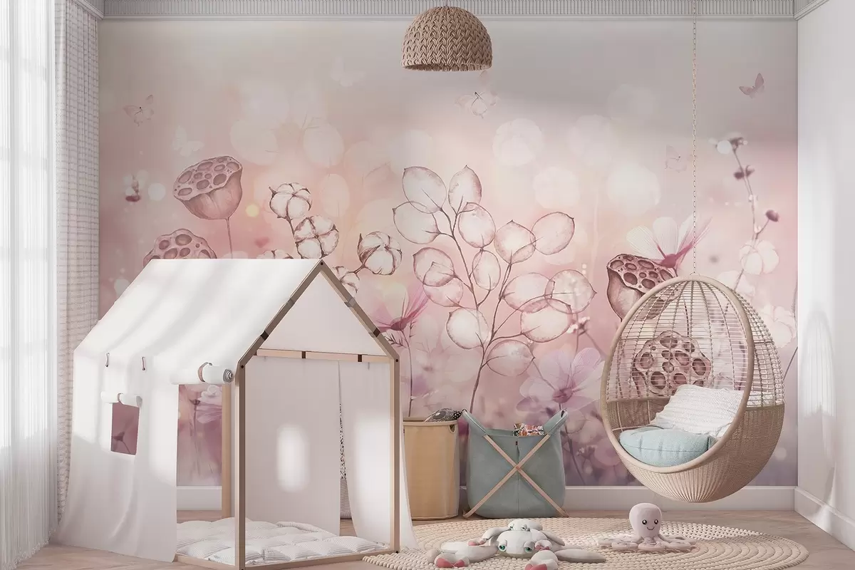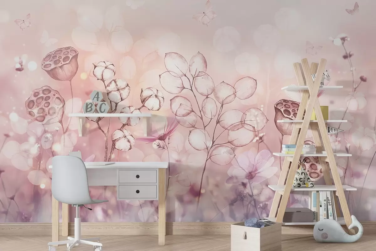 Fototapetai Svajingas gėlių sodas, drugelis, medvilnės gėlės, lotosai, rožinės spalvos Nr. w02516
