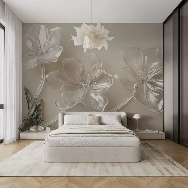 Fototapetai didelės gėlės iš stiklo imitacijos smėlio spalvos fone Nr. w02518