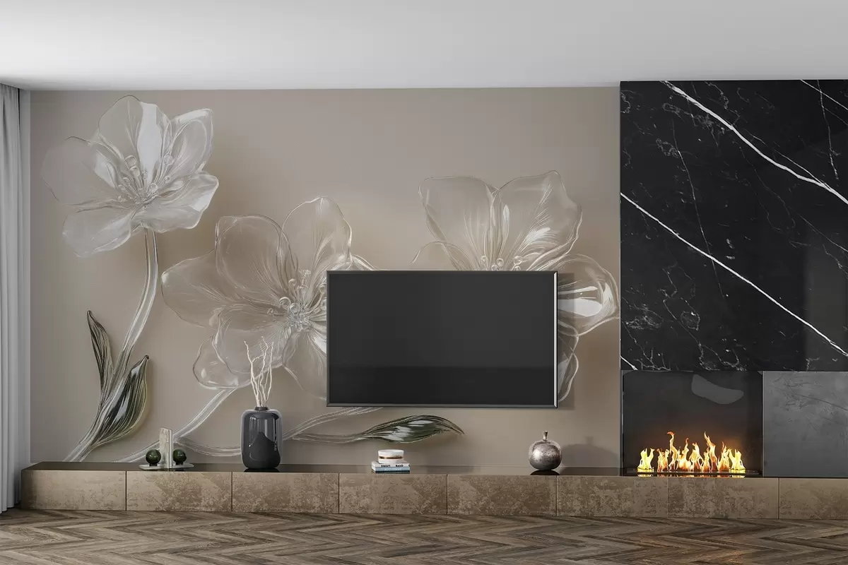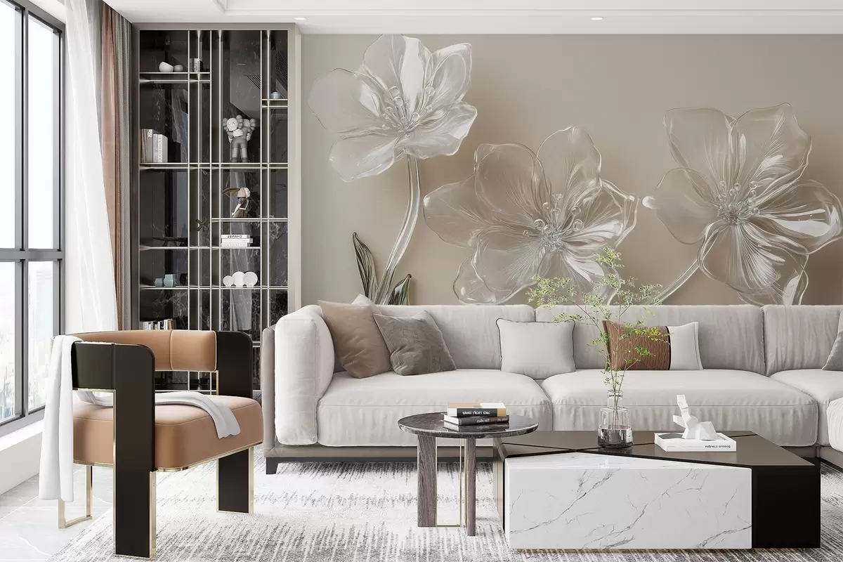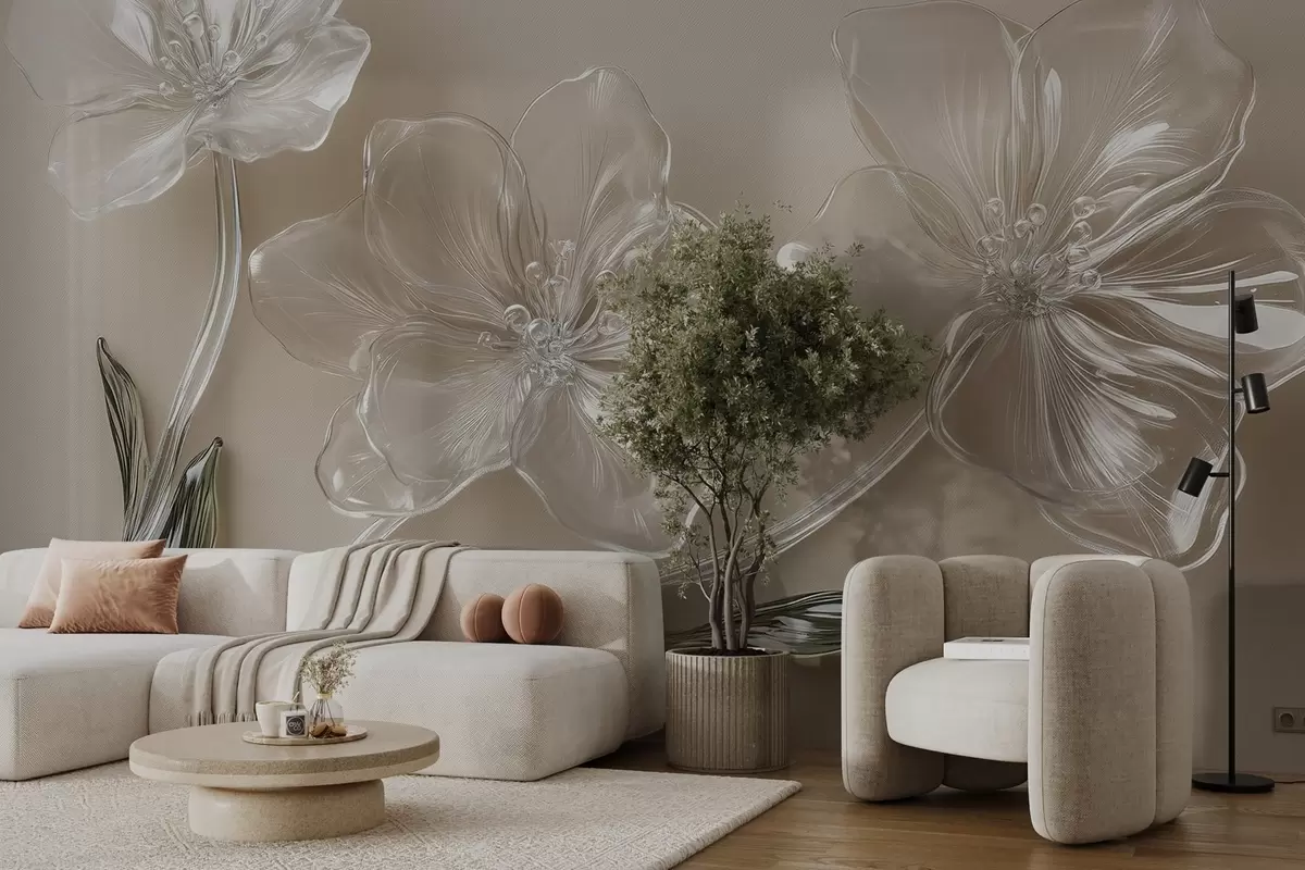Fototapetai didelės gėlės iš stiklo imitacijos smėlio spalvos fone Nr. w02518