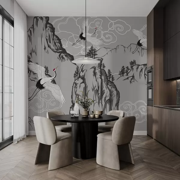 Fototapetai Japoniško stiliaus kalnai ir gervės, pilki tonai Nr. w02544v1
