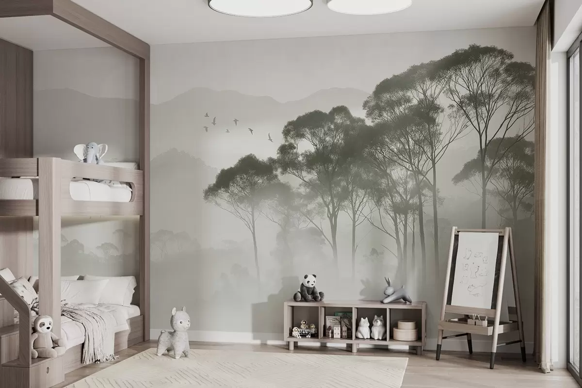 Fototapetai Medžiai rūke, gamtos peizažai, paukščiai, saulė, žalios spalvos Nr. w02740