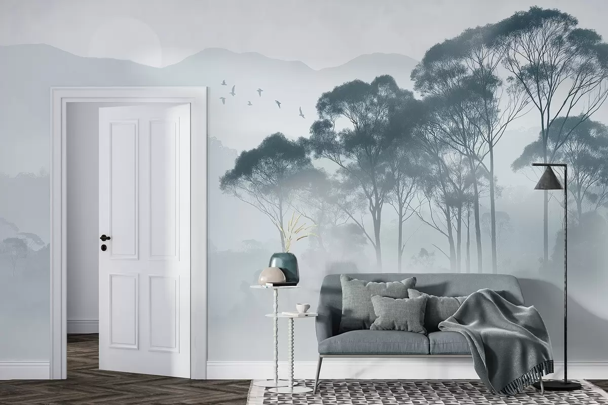 Fototapetai Medžiai rūke, gamtos peizažai, paukščiai, saulė, mėlynos spalvos Nr. w02740v1