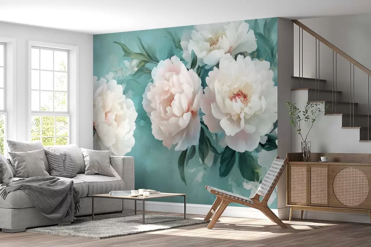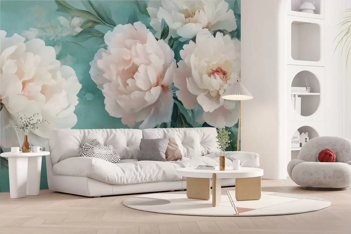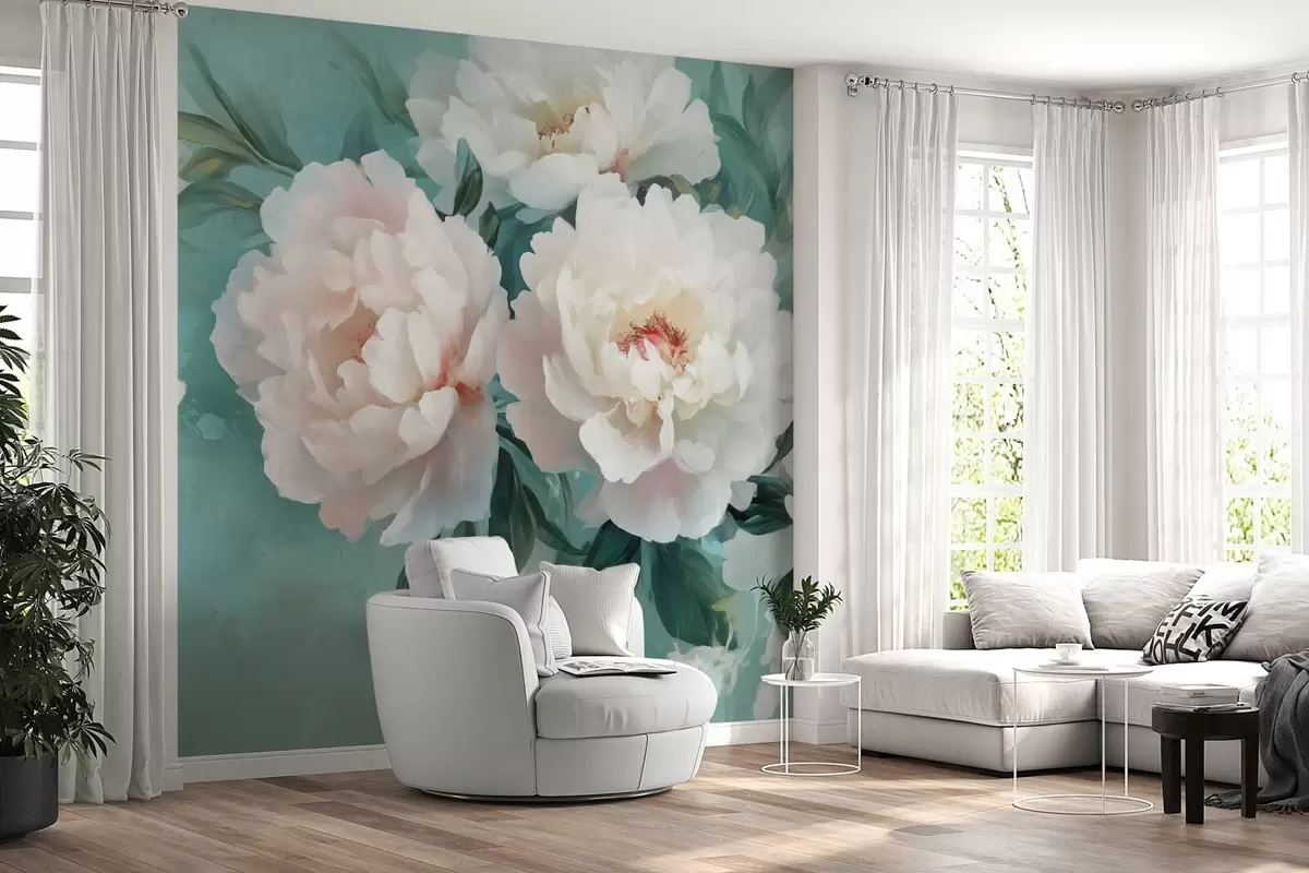 Fototapetai didelės gėlės sodrių bijūnų turkio spalvos fone Nr. w02763