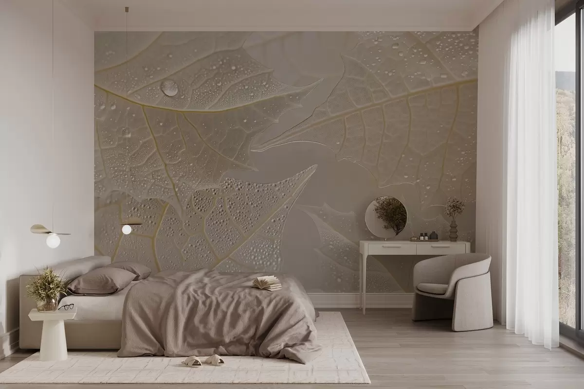 Fototapetai Smėlio spalvos lapų su gyslomis ir rasos lašeliais stambiu planu Nr. w02872