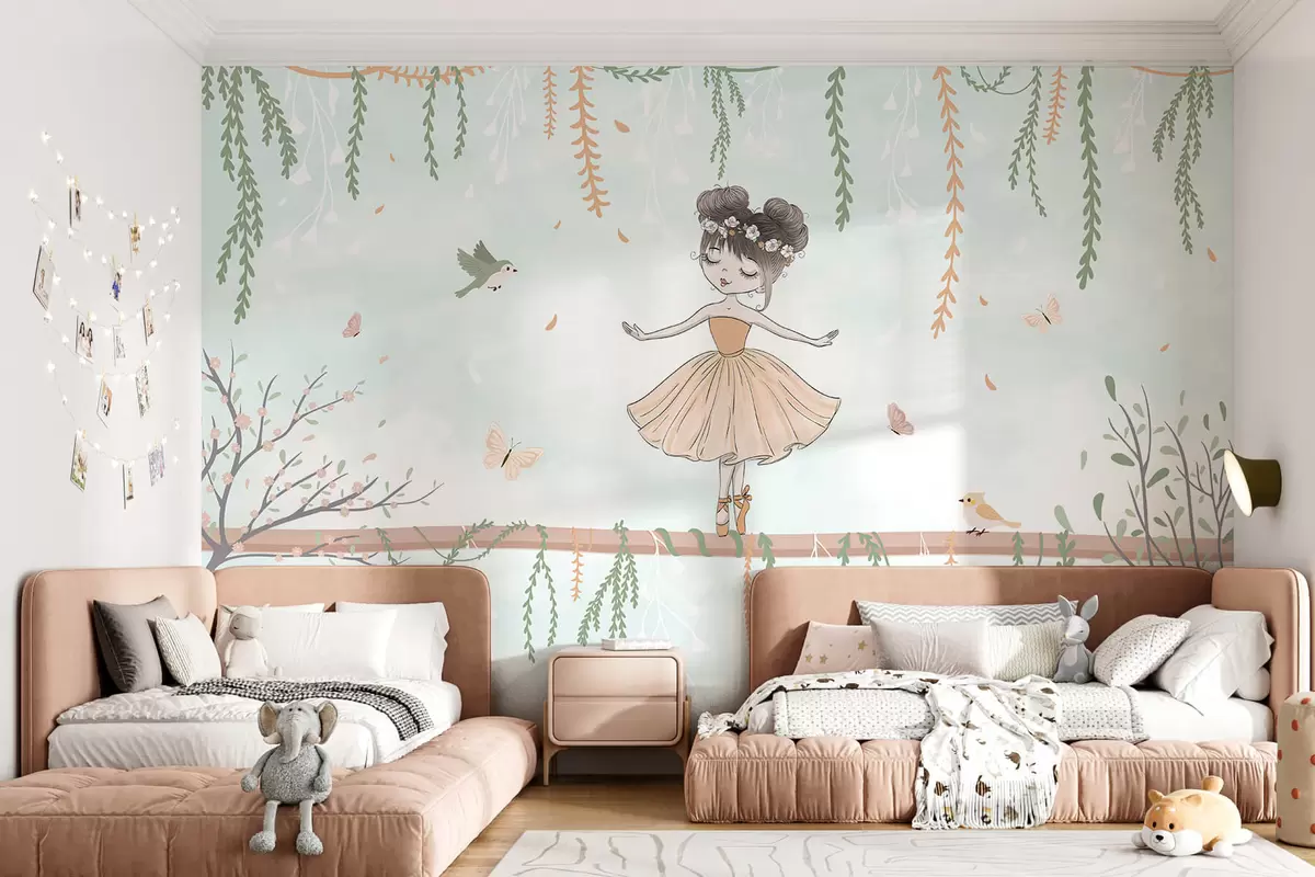 Fototapetai Kraštovaizdis su princese, paukščiais ir drugeliais Nr. w03003v1