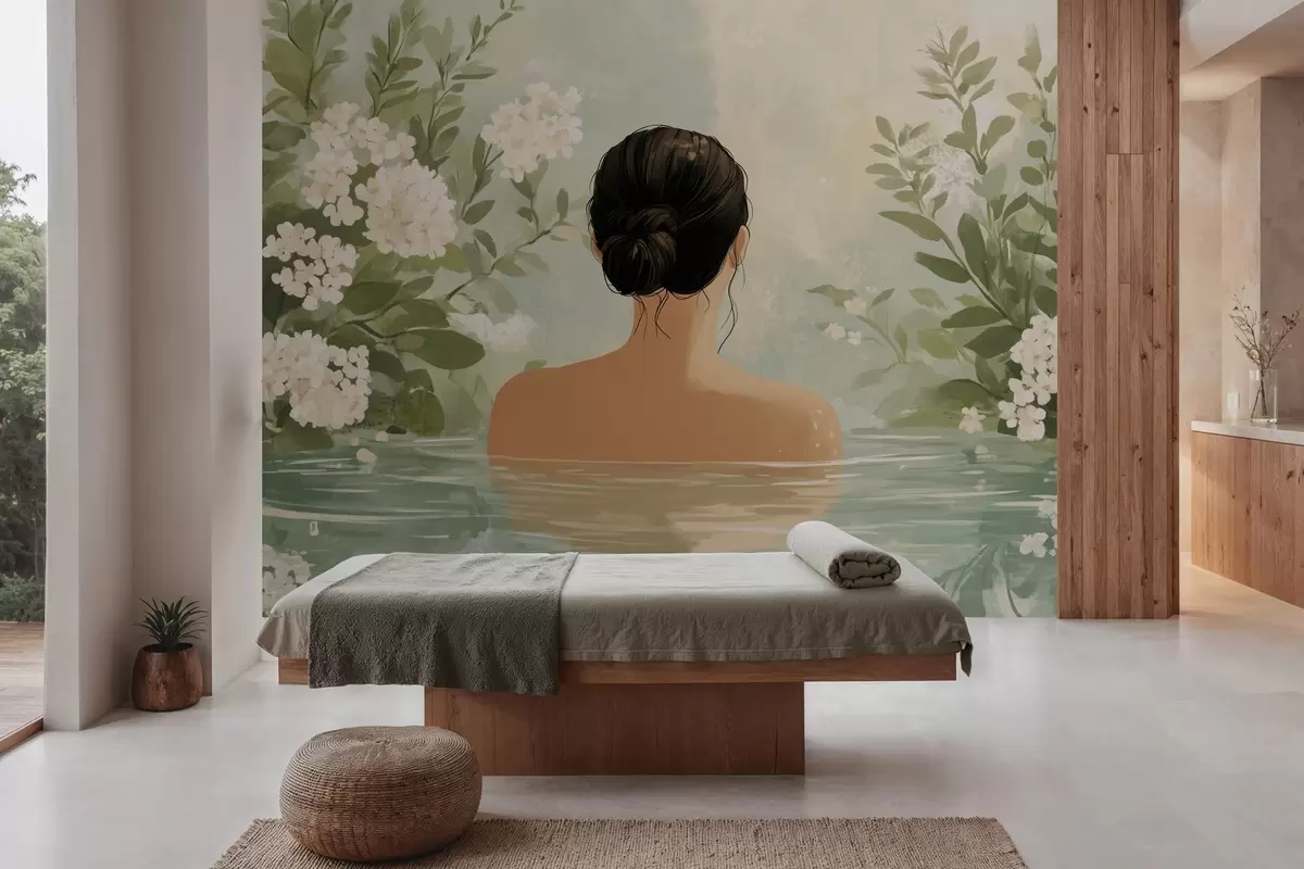 Fototapetai rami ir svajinga botaninė iliustracija, kurioje vaizduojama moteris, besimaudanti ramiame, atspindinčiame vandens telkinyje, apsupta vešlios žalumos ir švelnių baltų gėlių. Nr. w03014