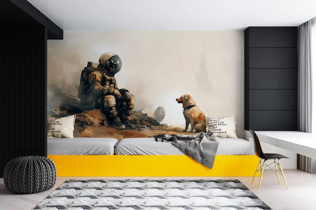 Fototapetai postapokaliptinis kraštovaizdis su astronautu ir šunimi Nr. w03115