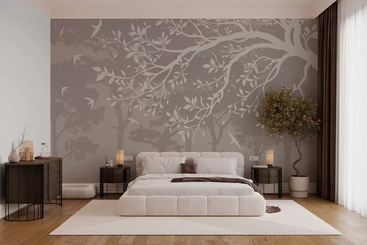 Fototapetai kreminės medžio šakos su paukščiais siluetas miško fone Nr. w03116