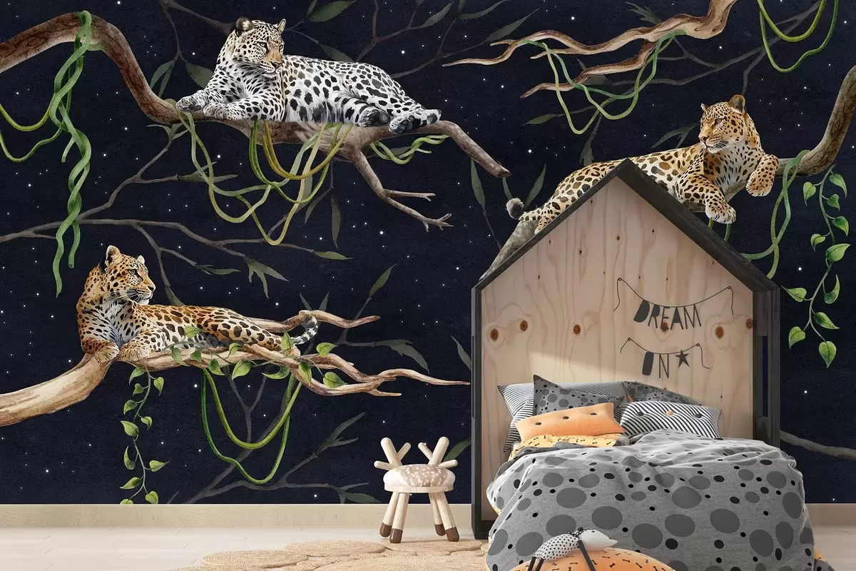 Fototapetai Leopardai ant džiunglių medžių, lianos, atogrąžų, laukiniai gyvūnai, naktinis dangus su žvaigždėmis Nr. w03148