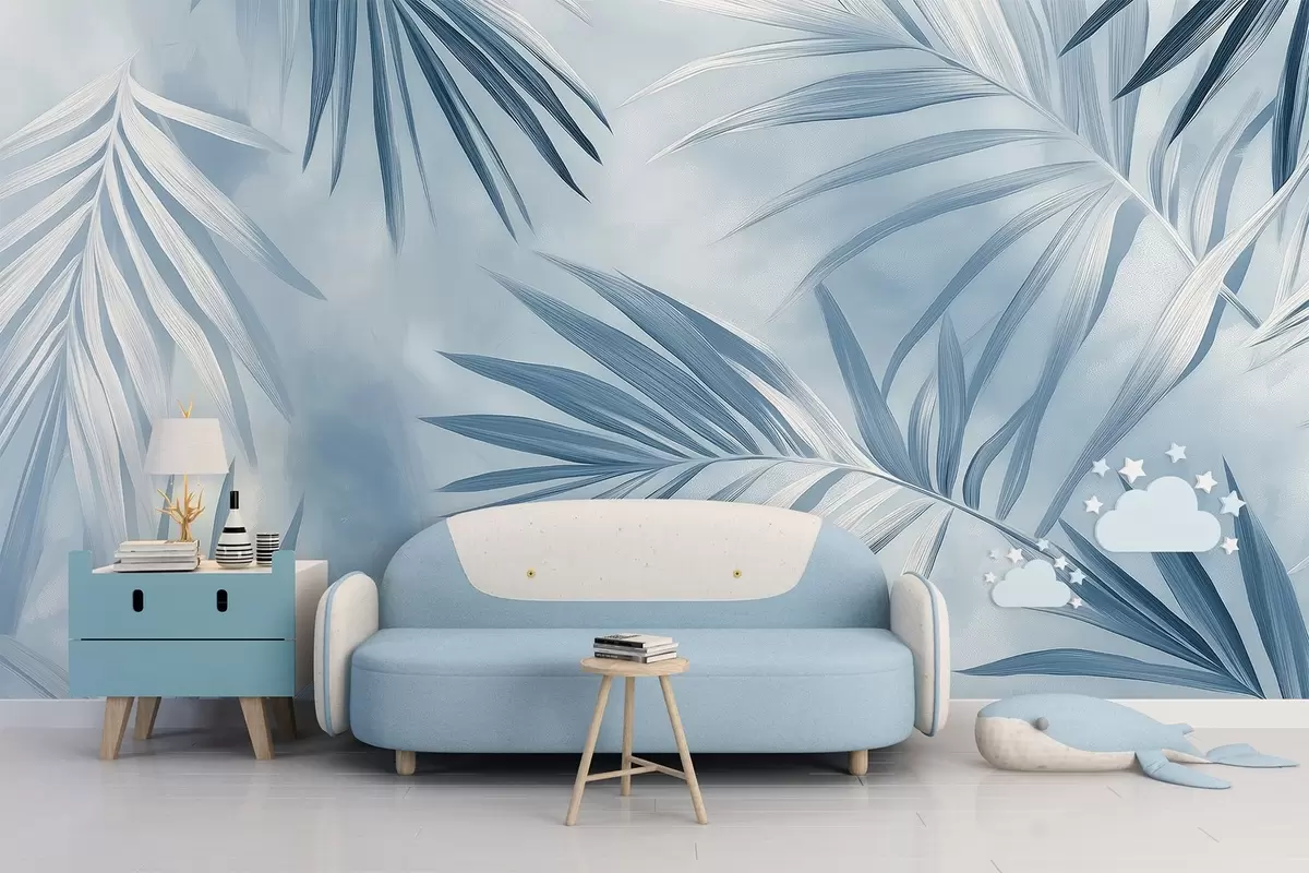 Fototapetai Atogrąžų lapų abstrakcija, palmė, mėlyna spalvų paletė Nr. w03153