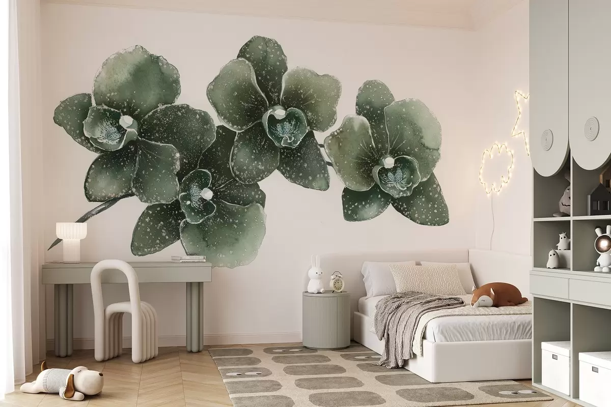 Fototapetai Orhidėjos gėlės šaka, akvarelės stilius, gėlių, žalios spalvos Nr. w03165v1