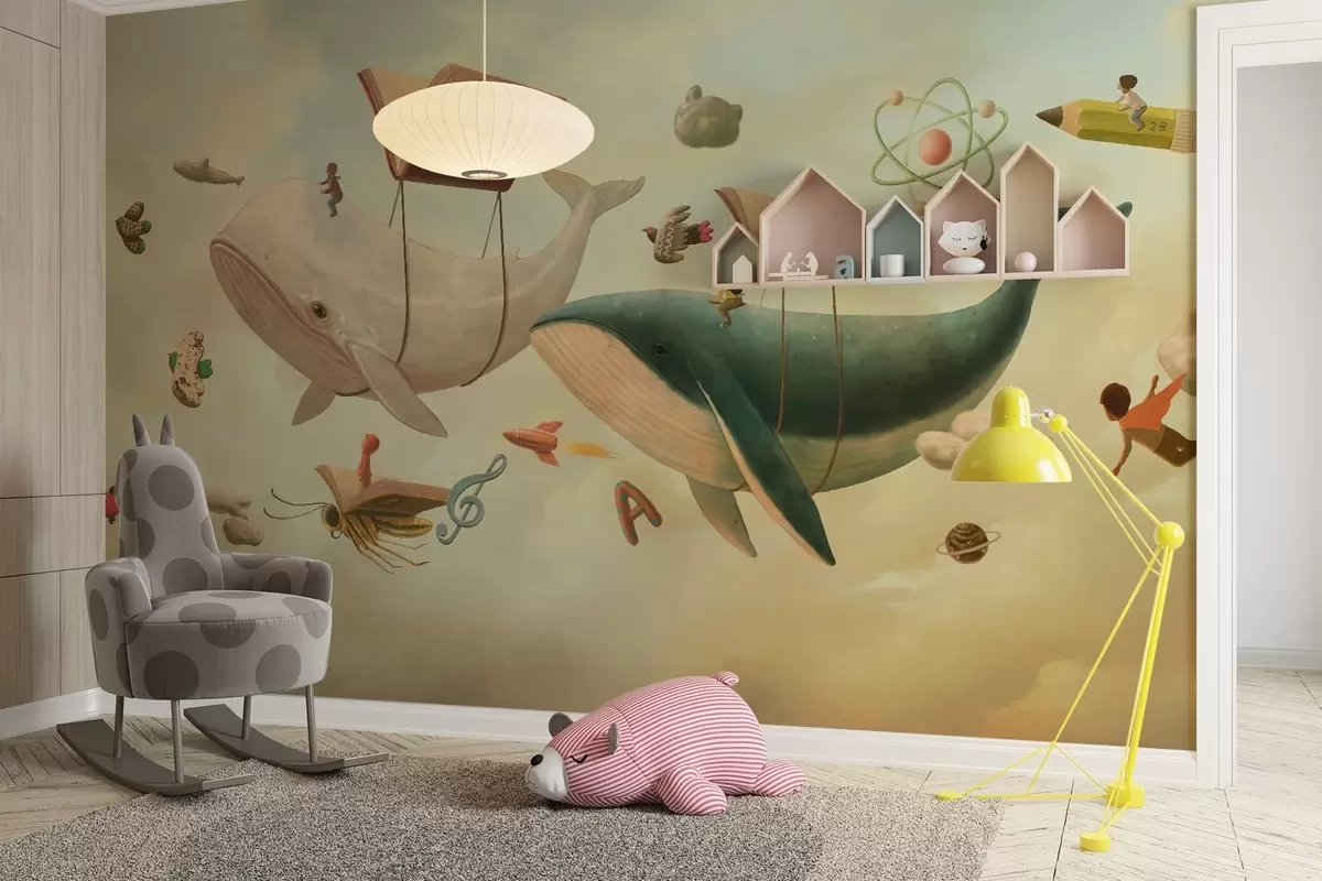 Fototapetai Nuotaikinga iliustracija, kurioje banginiai plaukioja danguje po knygos formos balionais Nr. w03327v1