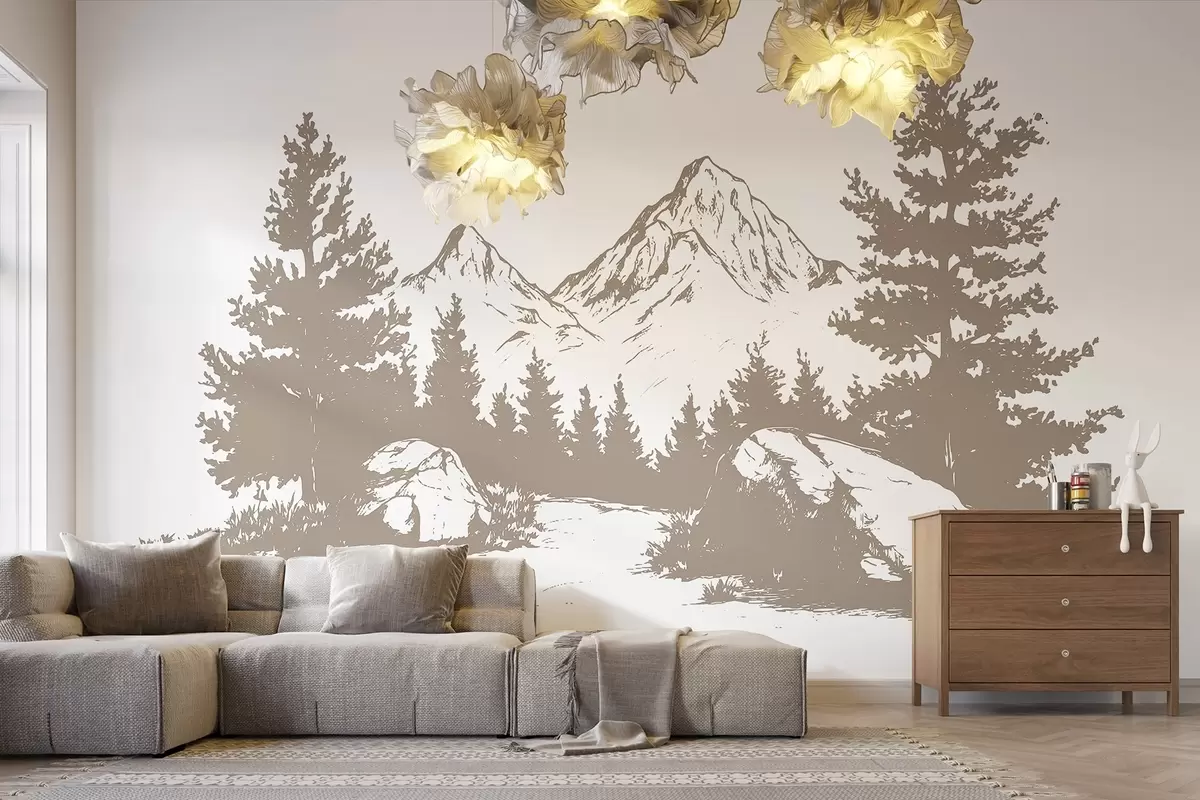 Fototapetai Alpės, kalnai su mišku, linijinis piešinys, smėlio spalvos Nr. w03342