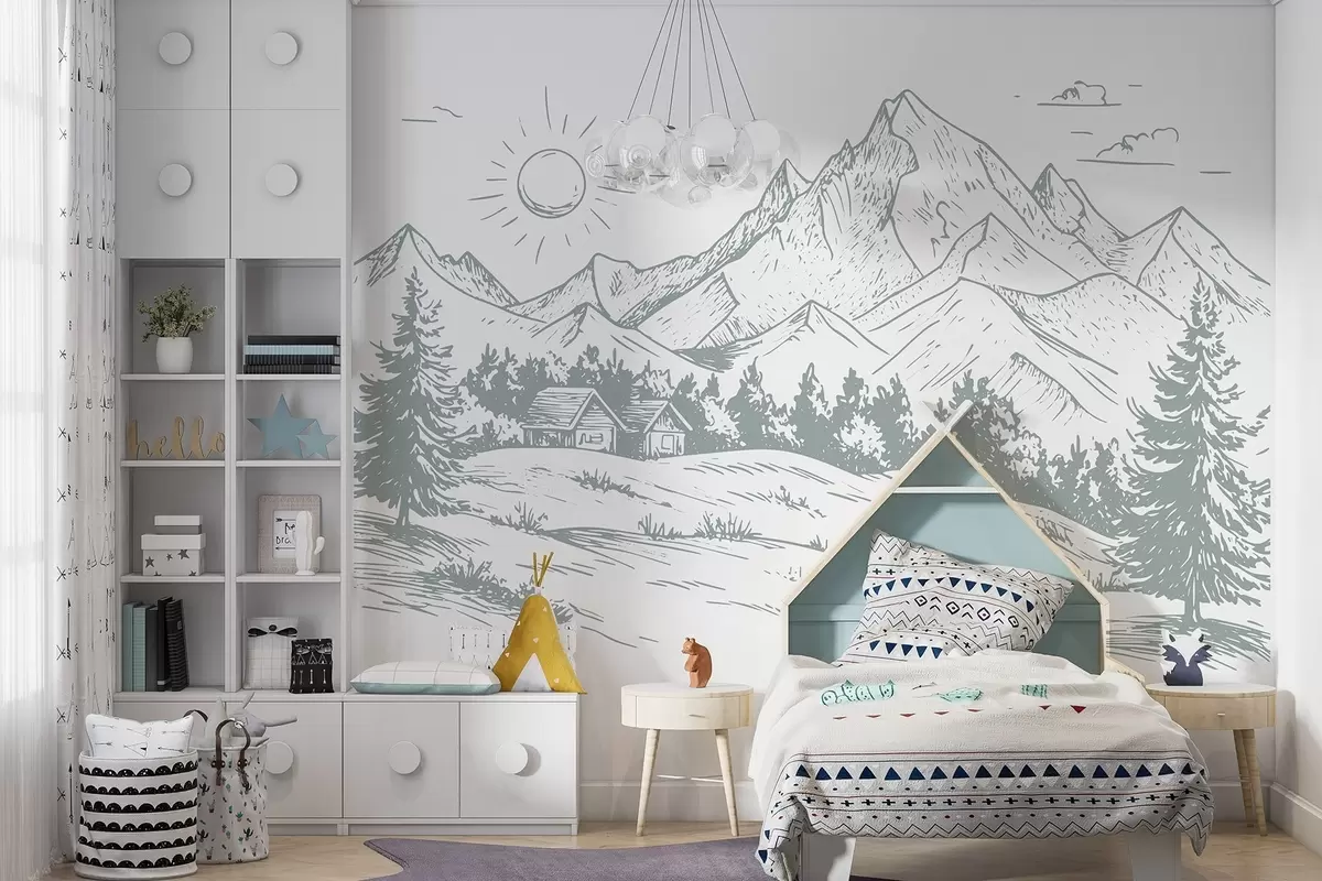Fototapetai Kalnai piešinys, gamtos peizažai, miškas, mediniai namai, mėtų spalva Nr. w03347v1