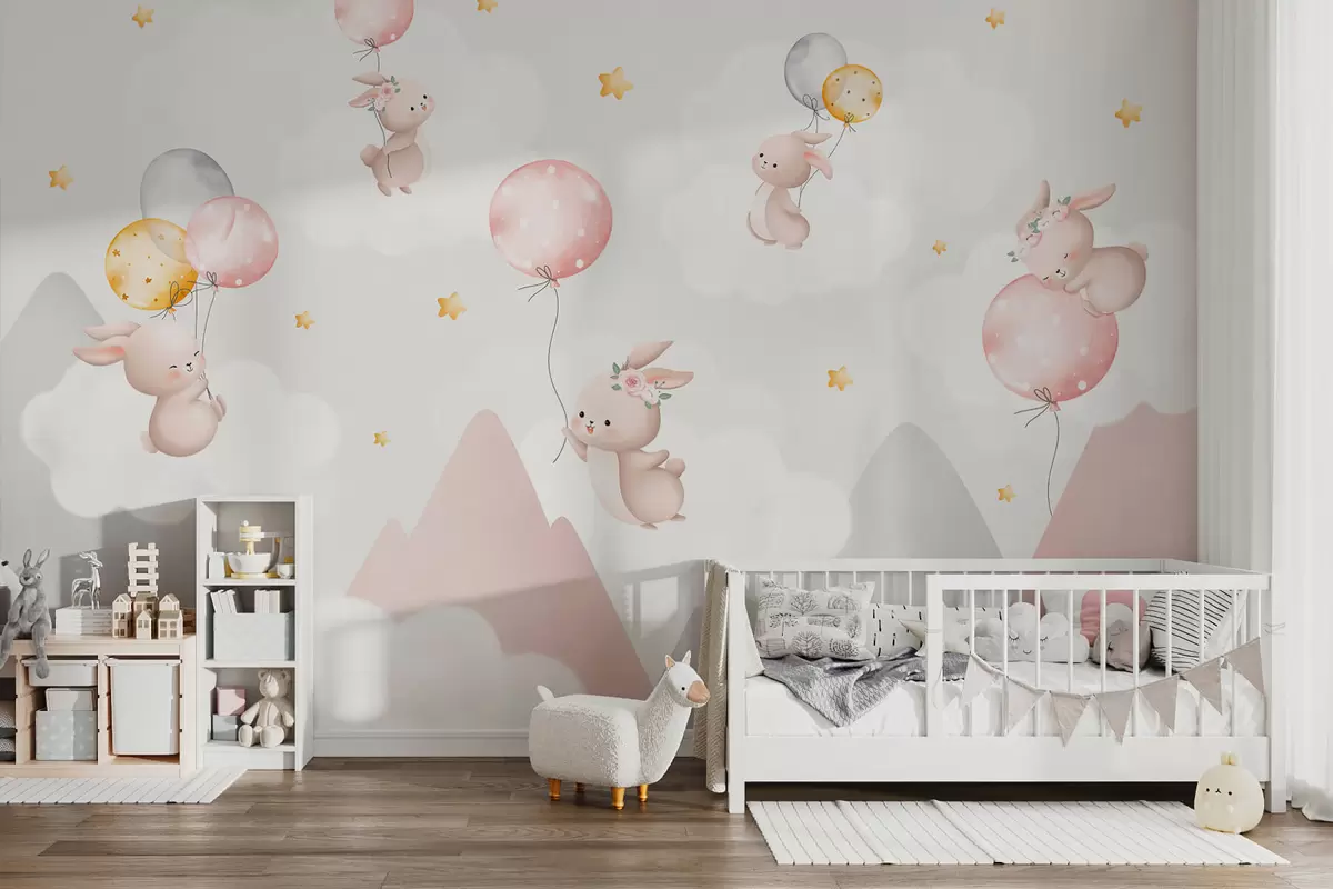Fototapetai Zuikučiai su balionais ant debesų tarp kalnų viršūnių Nr. w03375