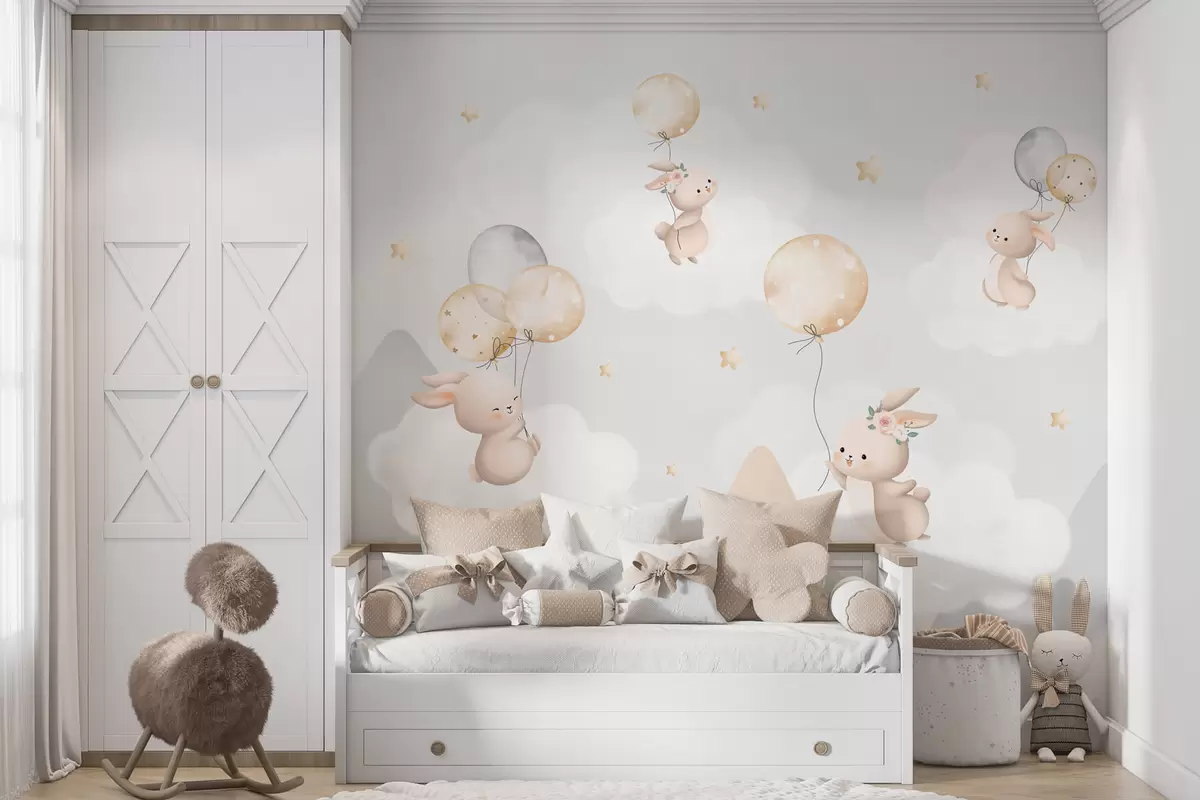 Fototapetai Zuikučiai su balionais ant debesų tarp kalnų viršūnių Nr. w03375v1