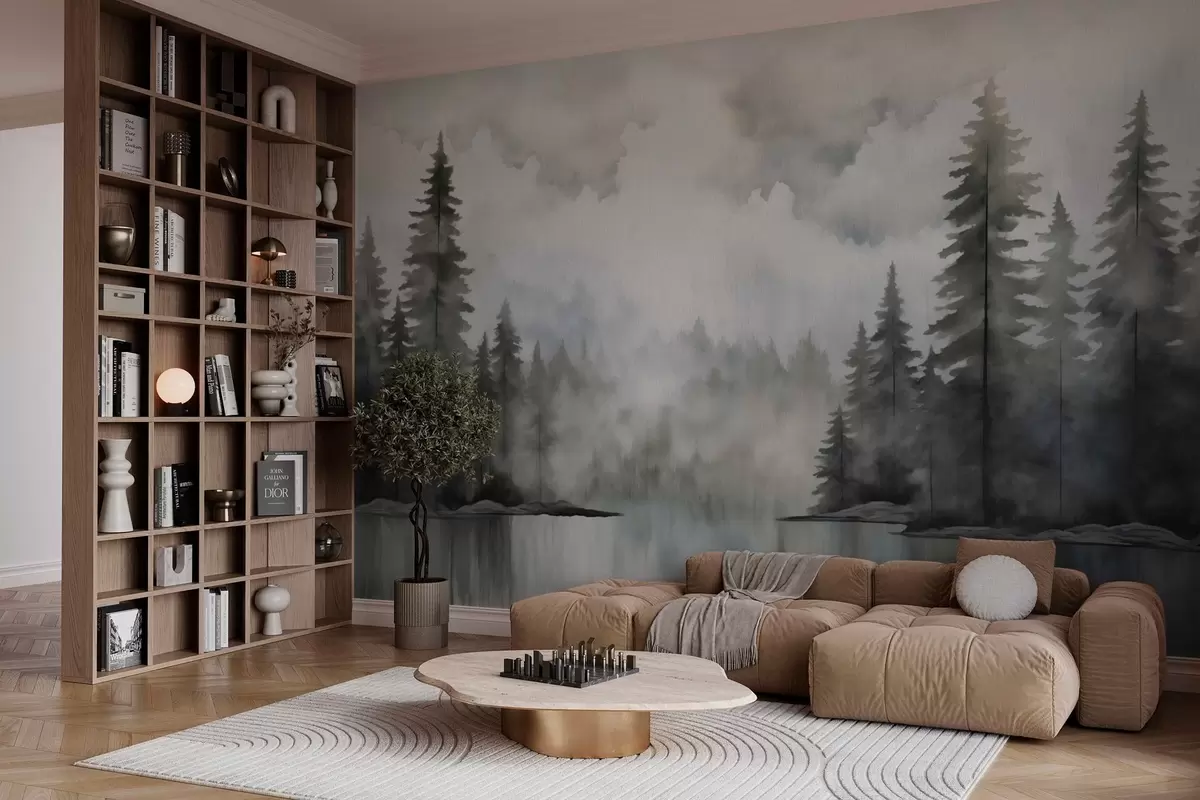 Fototapetai Miškas, ežeras ir debesuotas dangus akvarelės stiliumi Nr. w03387