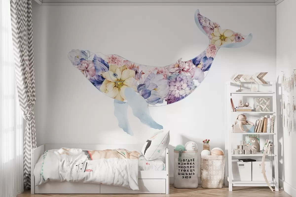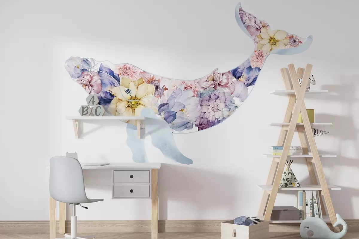 Fototapetai Gražus banginis su akvarelinėmis gėlėmis, jūros gyvūnais, spalvingas Nr. w03445
