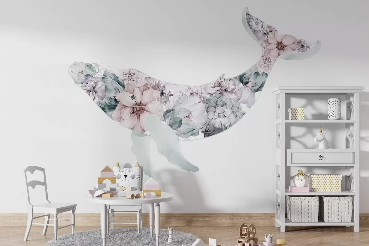 Fototapetai Gražus banginis su akvarelinėmis gėlėmis, jūros gyvūnai Nr. w03445v1