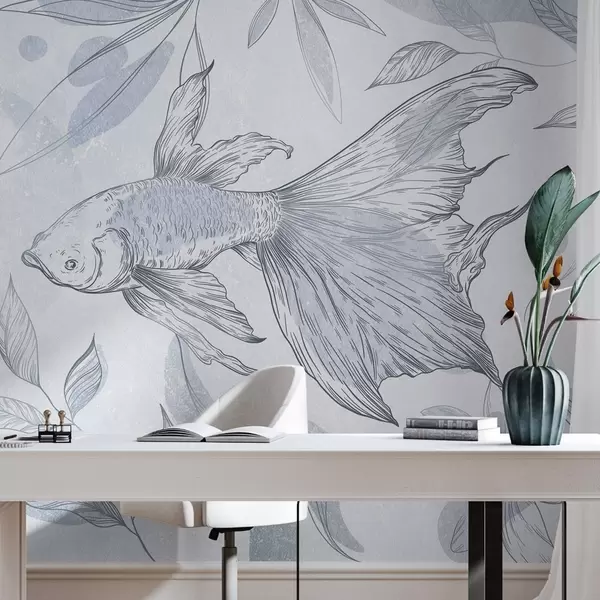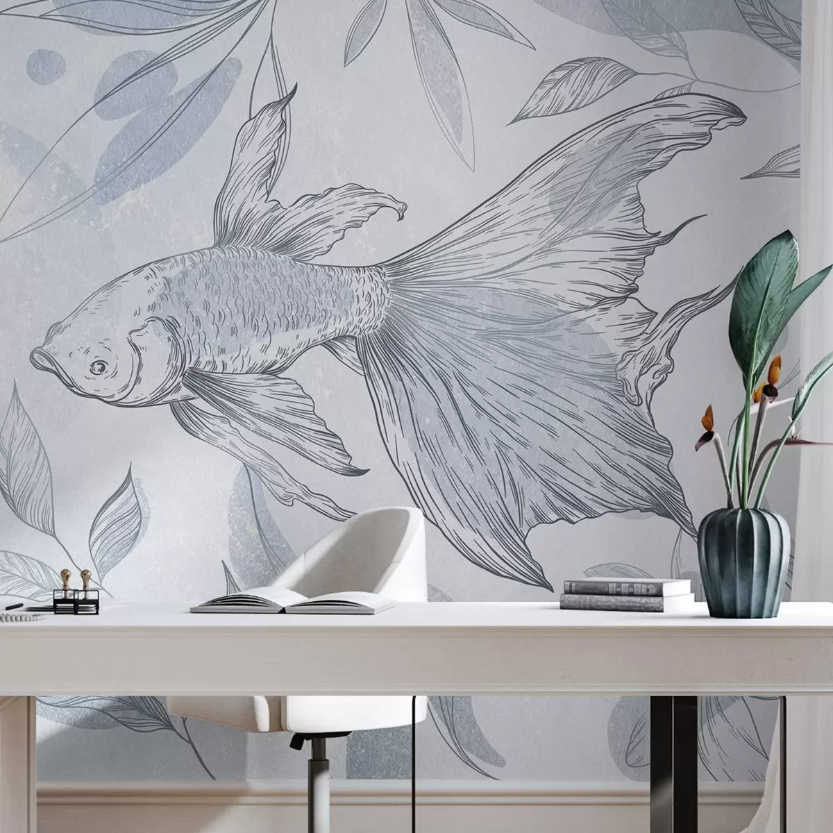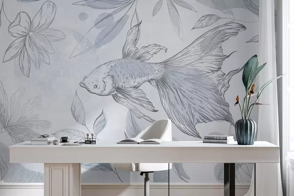 Fototapetai Žuvis su gėlių elementais, mėlynas fonas, linijinis piešinys Nr. w03517v2