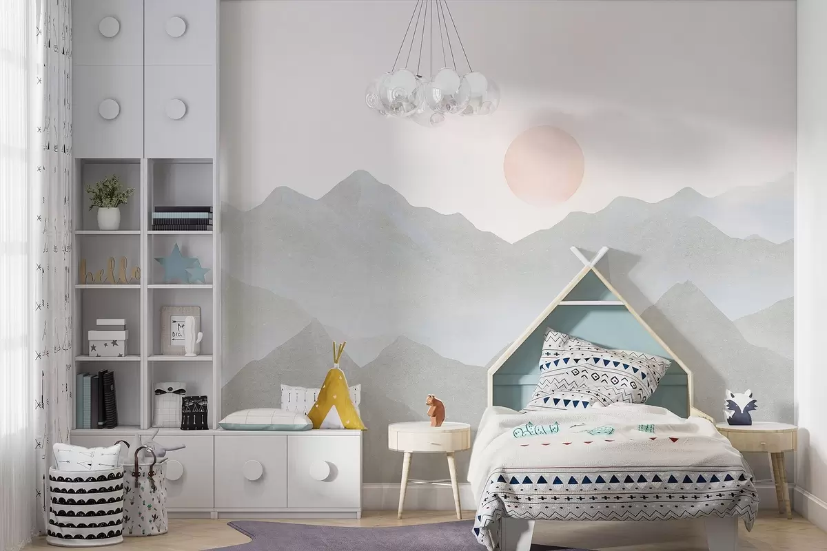 Fototapetai Boho stiliaus kalnų kraštovaizdis, saulėlydis, minkšta pastelinė, pilka Nr. w03547v1