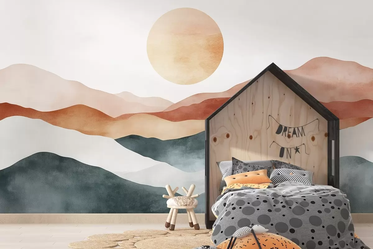 Fototapetai Akvareliniai kalnai su saule, boho stilius, raudona, oranžinė, pilka Nr. w03551