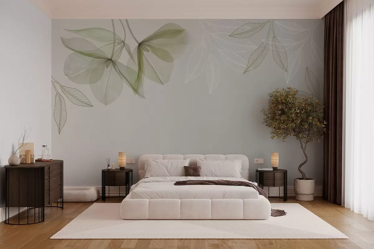 Fototapetai švelnios permatomos chaki atspalvių gėlės ir lapai Nr. w03616v2