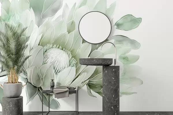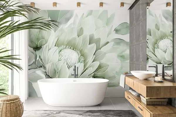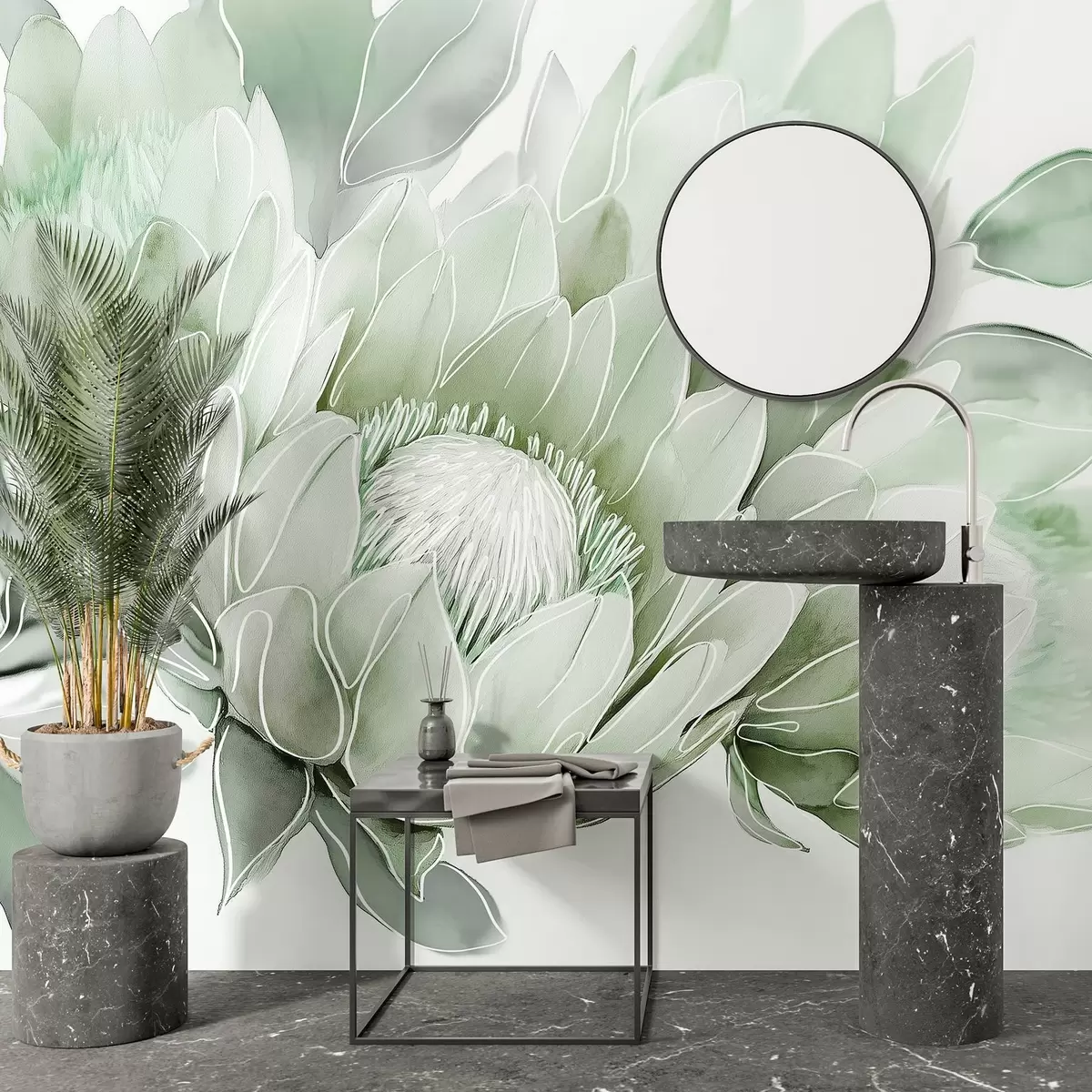 Fototapetai Gražios protea gėlės, linijinio meno piešinys, atogrąžų, žalios spalvos Nr. w03669v2