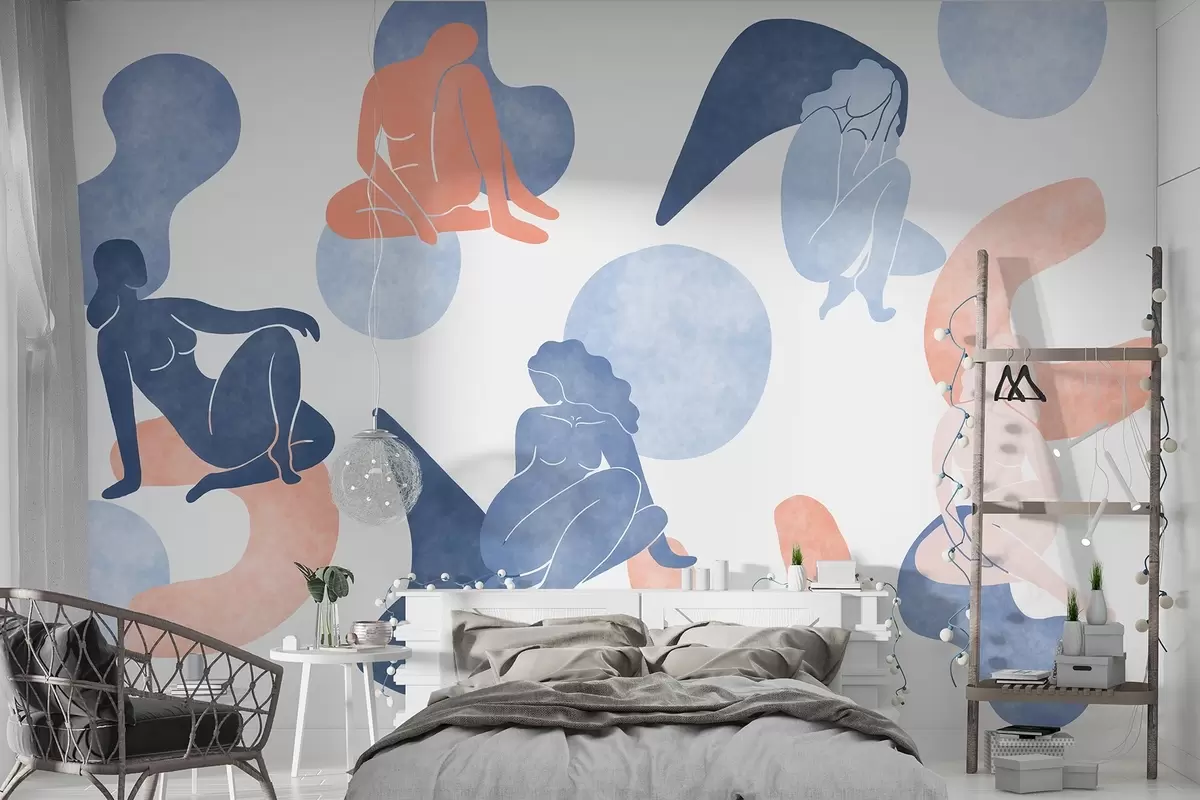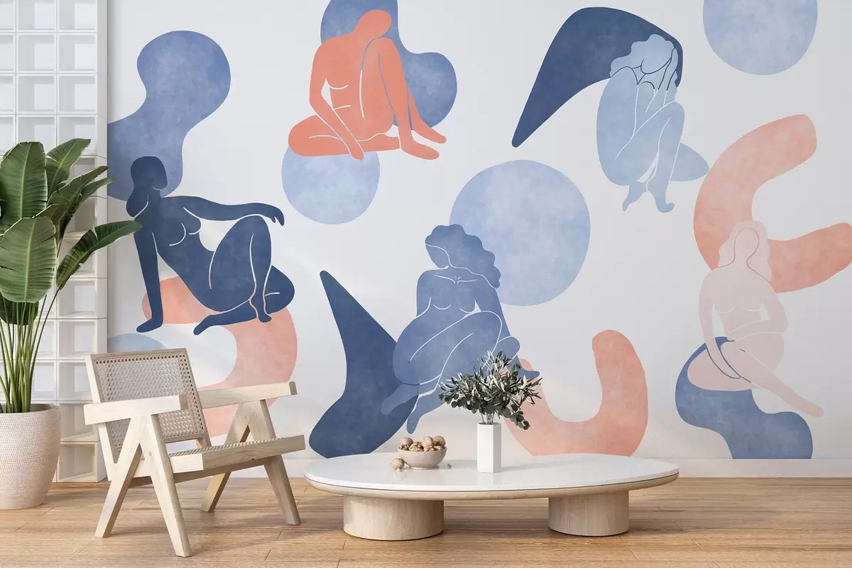 Fototapetai Geometrinės abstrakcijos su moterų siluetais, boho stilius, mėlyna, smėlio, rožinė Nr. w03753v1