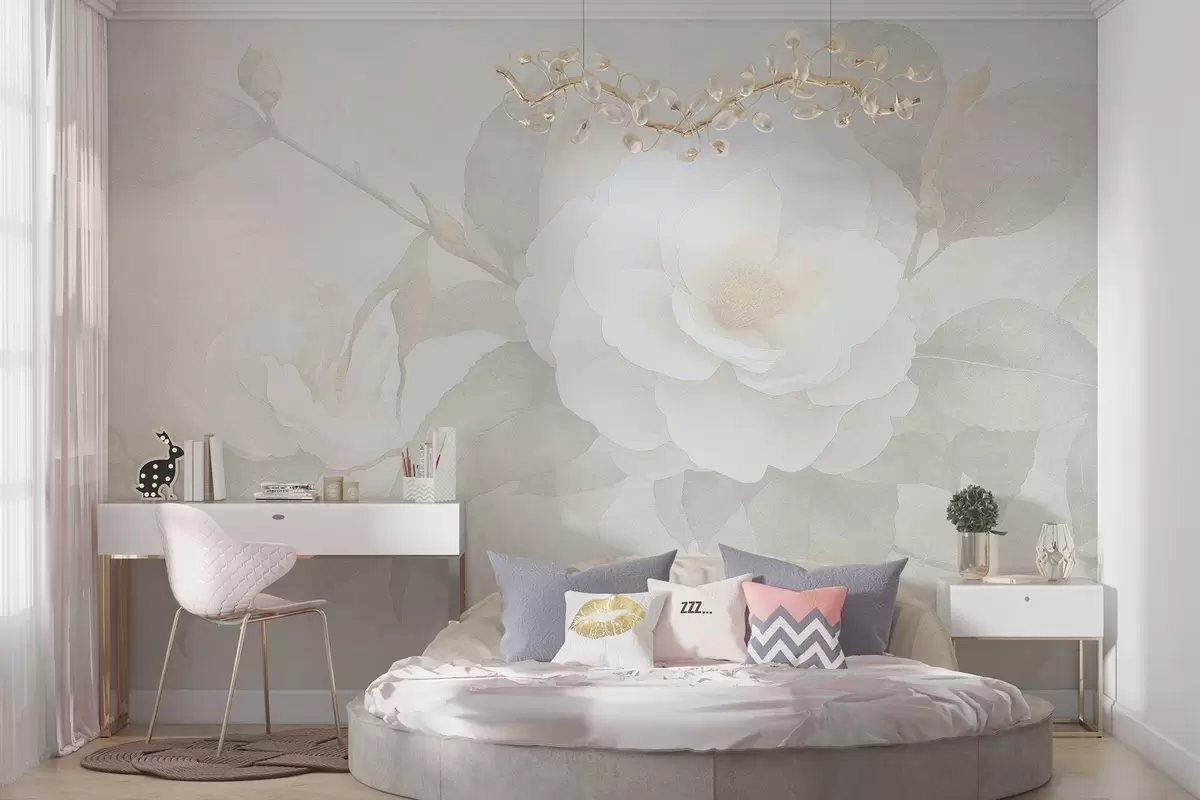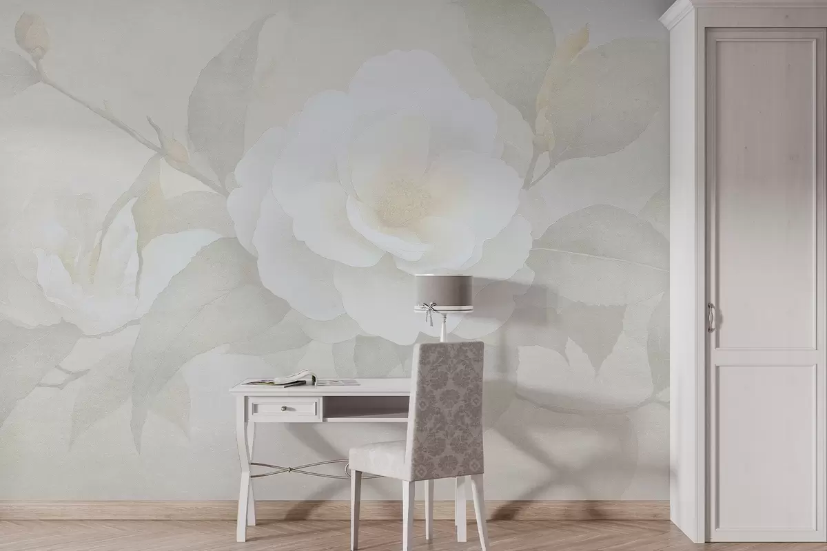 Fototapetai Minkšta pastelinė spalva su kamelijų žiedais ant šakos, smėlio spalvos Nr. w03760