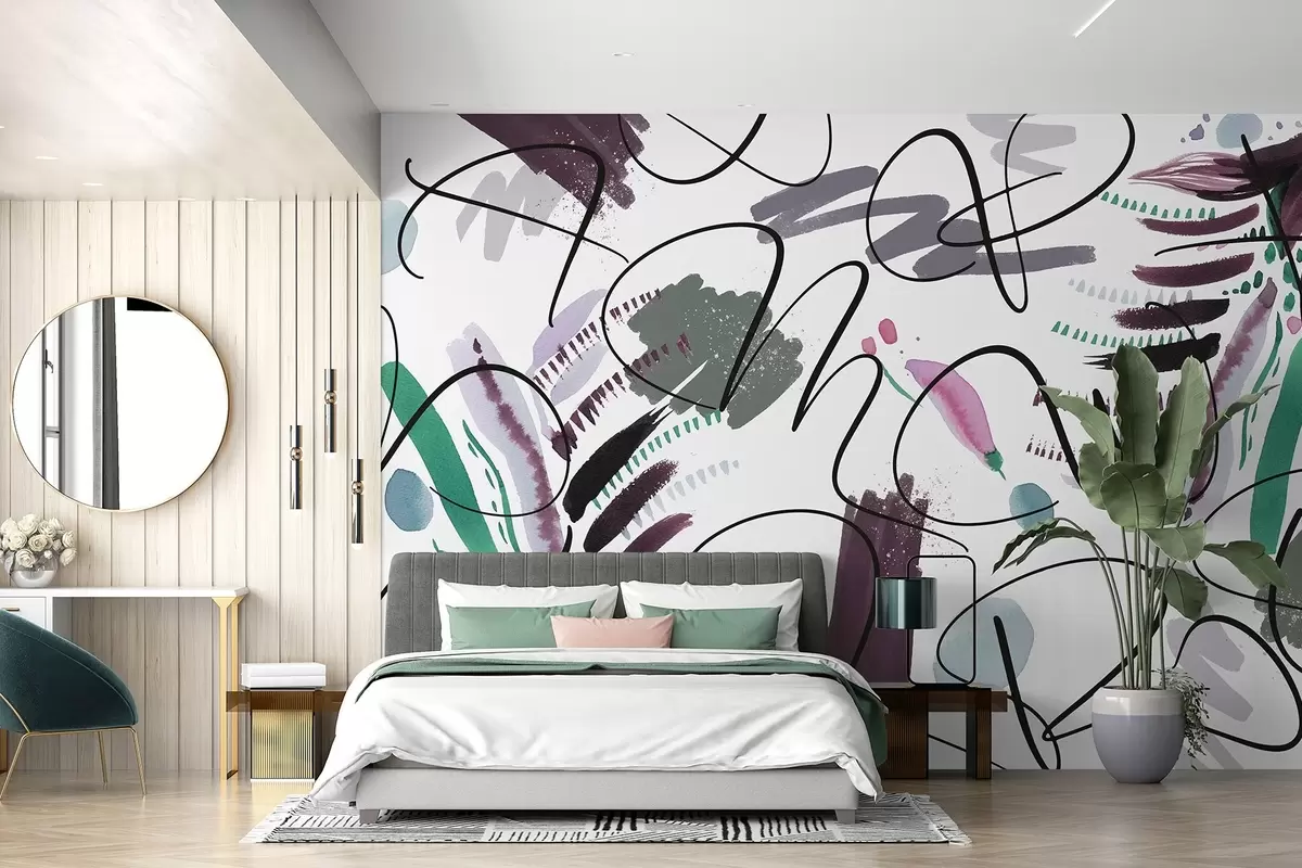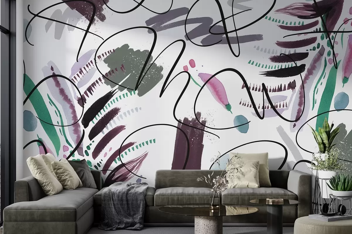 Fototapetai Tušo raidės, kaligrafija, teptuko potėpiai, pastelinės spalvos, abstrakcija Nr. w03912v1