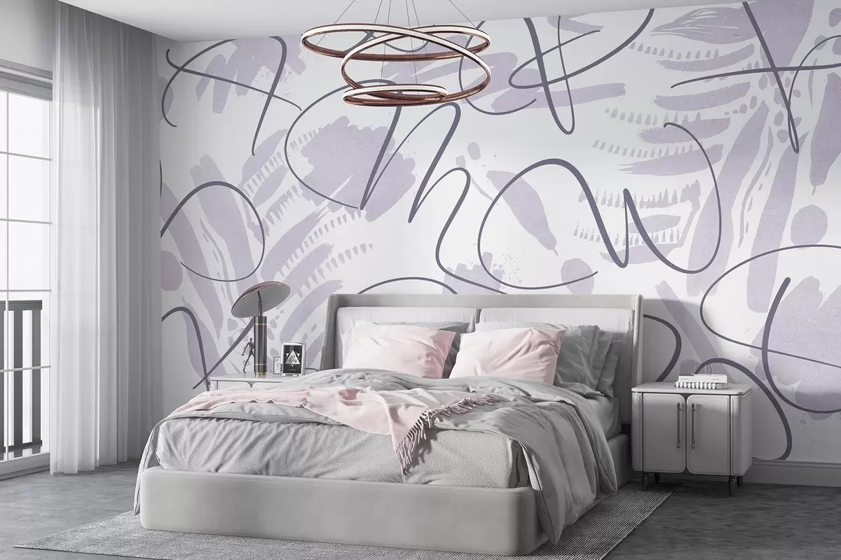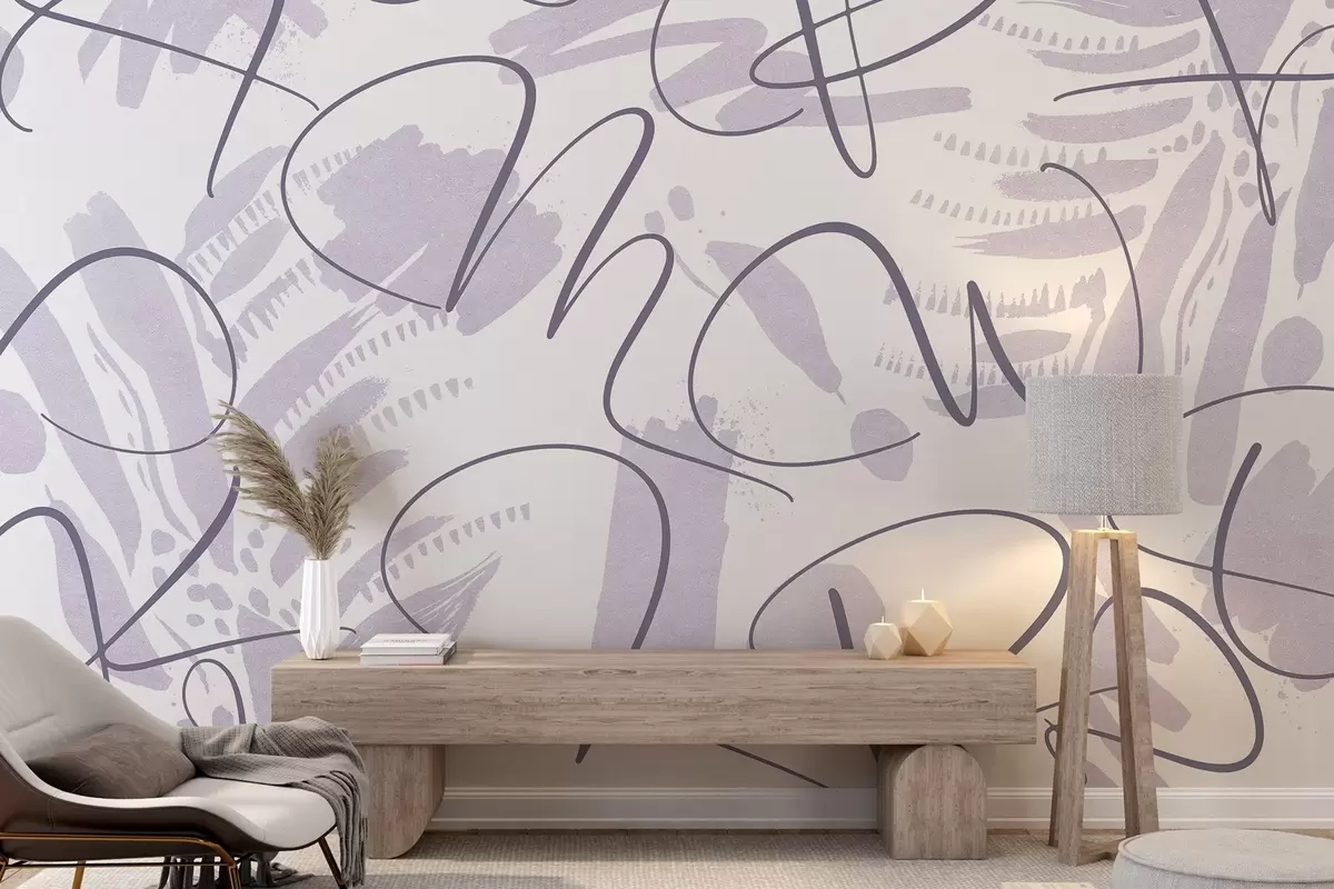 Fototapetai Kaligrafinė abstrakcija su raidėmis, teptuko potėpiais, violetine spalva Nr. w03913v2