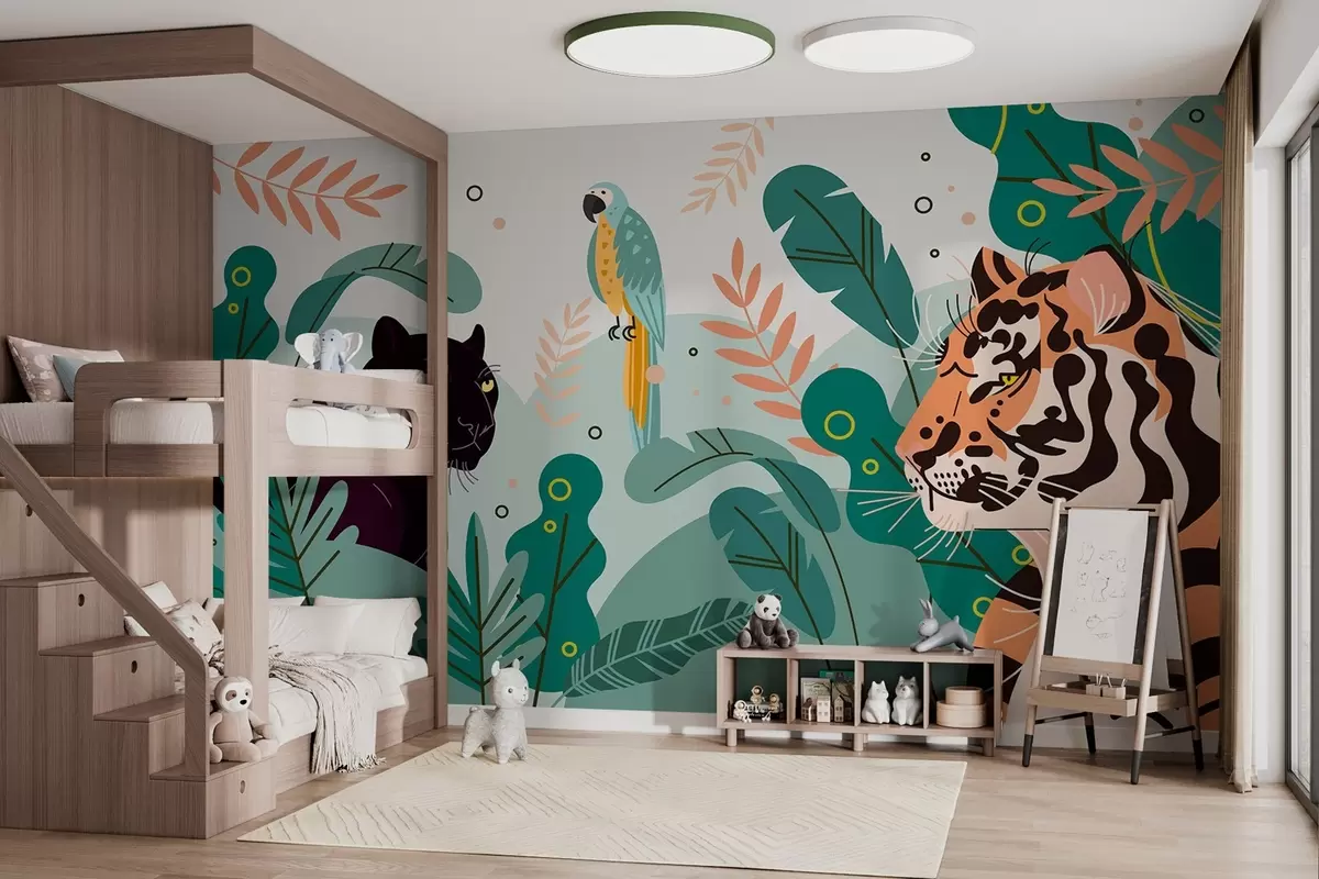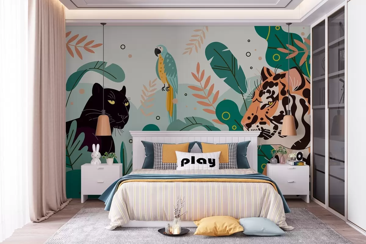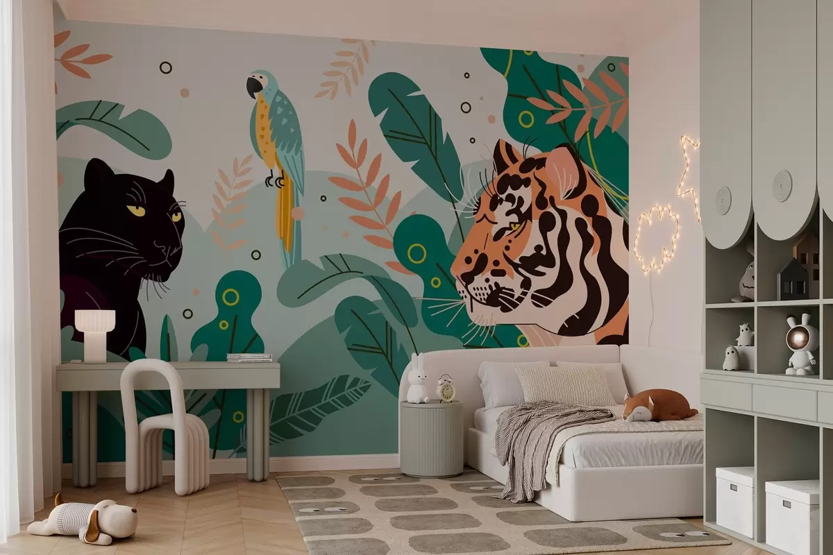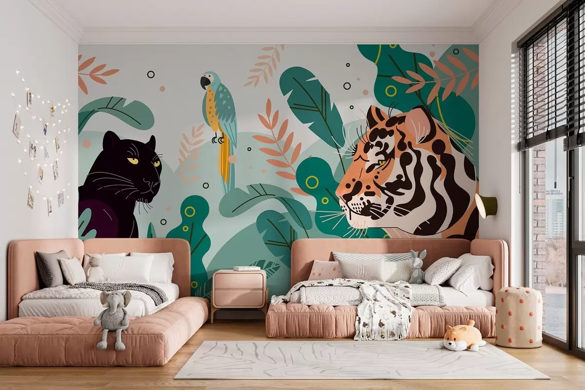 Fototapetai džiunglės su tigru, pantera ir papūga Nr. w03958